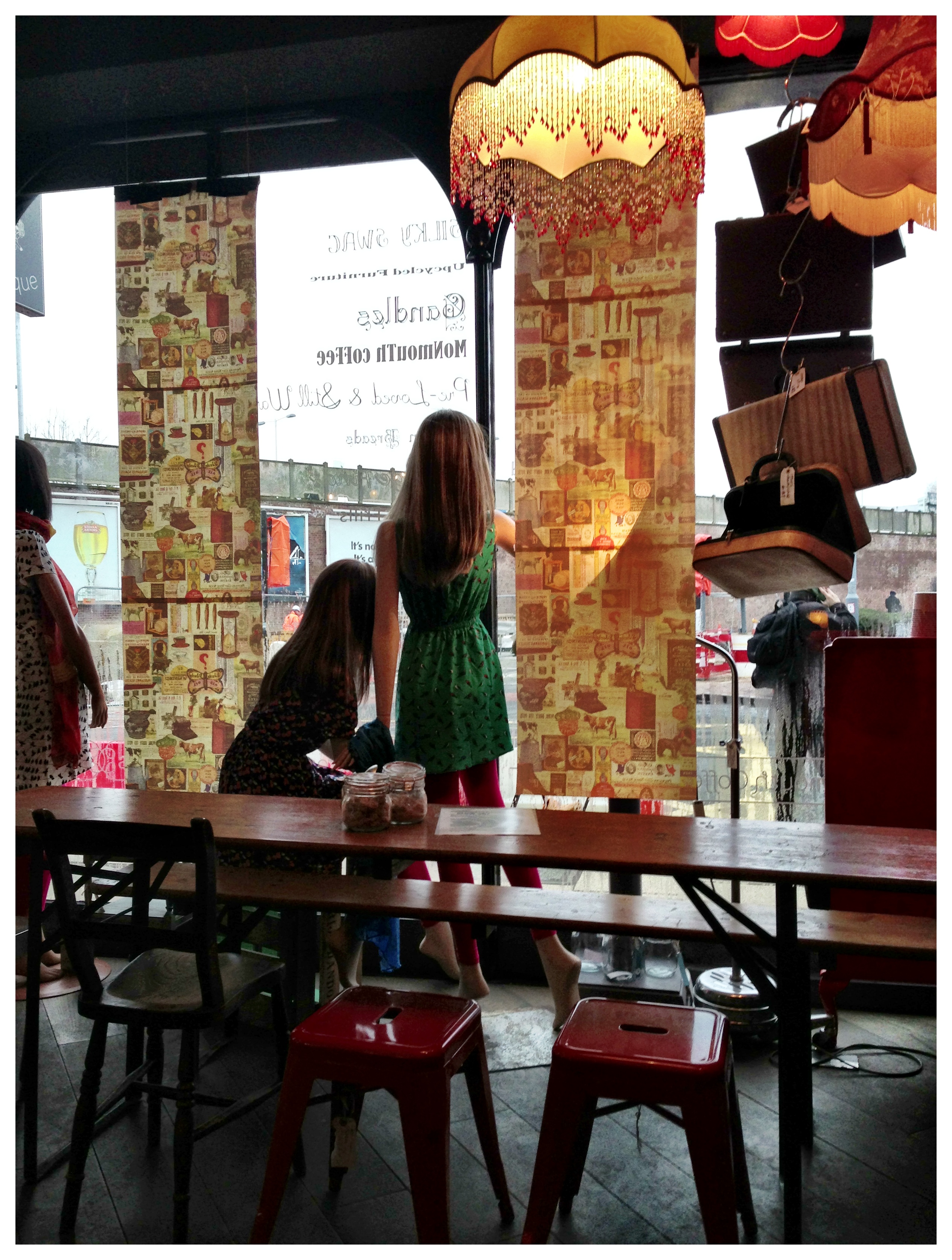 Oh, I see, it’s like that, is it? 😀 A case of I’ll Show You Mine If You Show Me Yours! Well, you do got those lovely chintzy lampshades. And what’s that, stringing Christmas decorations in the window made out of suitcases, well I never! And syrup!