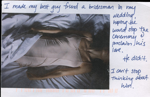 Do you know postsecret.com? It’s an online community art project where anyone can anonymously send in a postcard with a secret written on one side…which is then uploaded in all it’s gory glory. From the confessions of a disco queen to the thwarted angst of true love, each one reminds me of the Ernest Hemingway six-word novel: