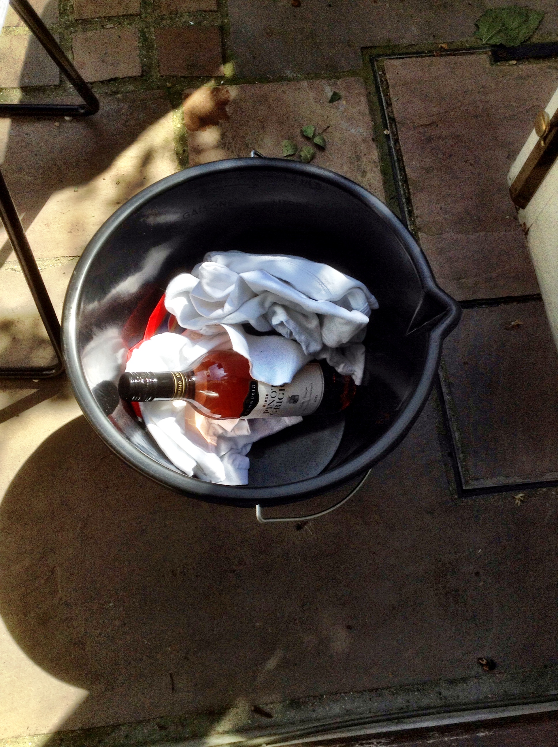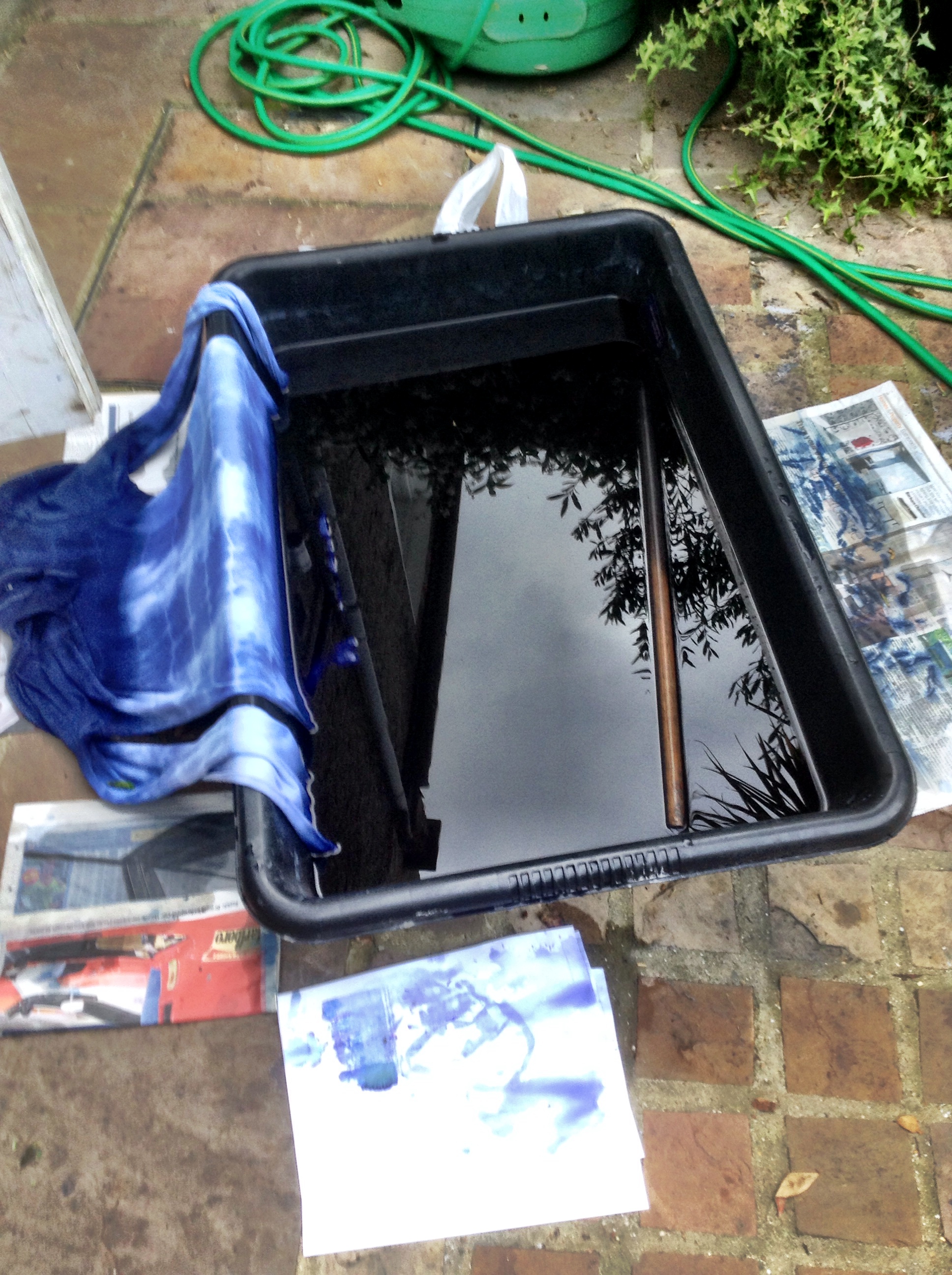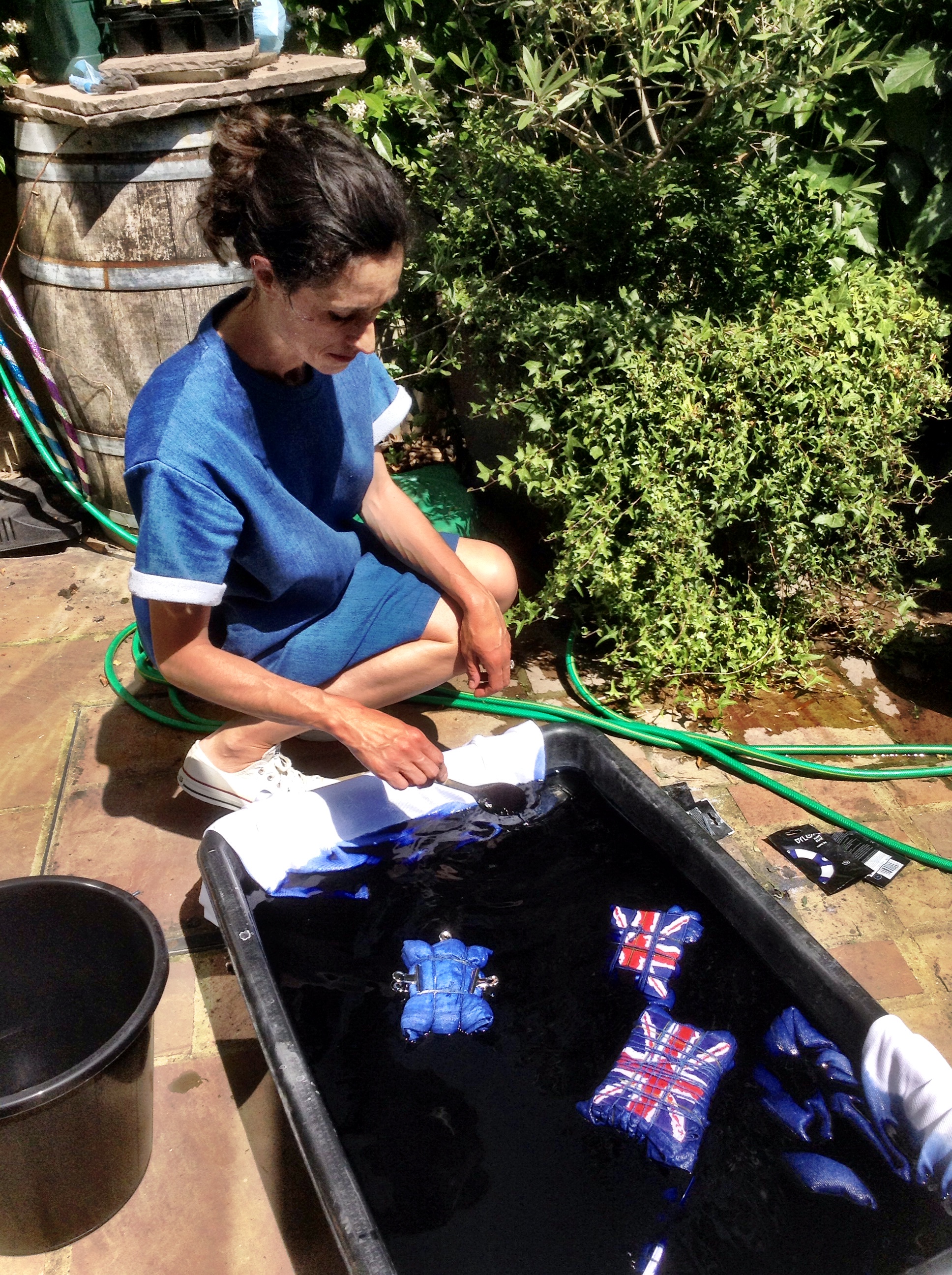 Our patriotic dye bath..previously used for mixing concrete for the patio. The union jacks come from cut up passport covers from the 99p shop – they were perfect for holding the material in place to create the square shaped tie-dye pattern.