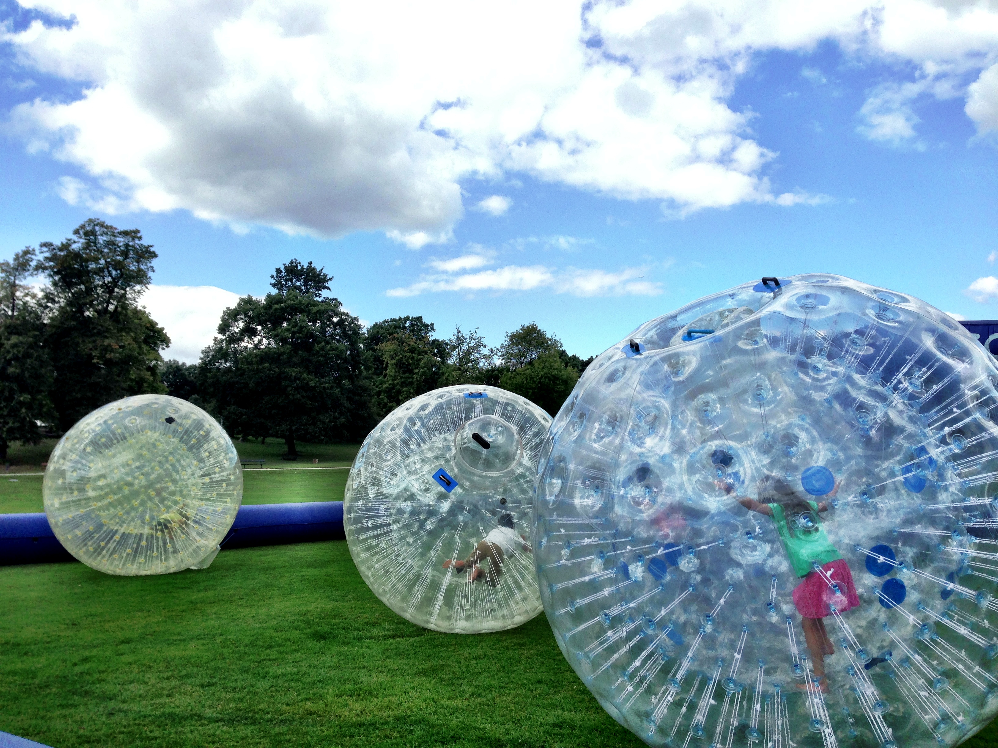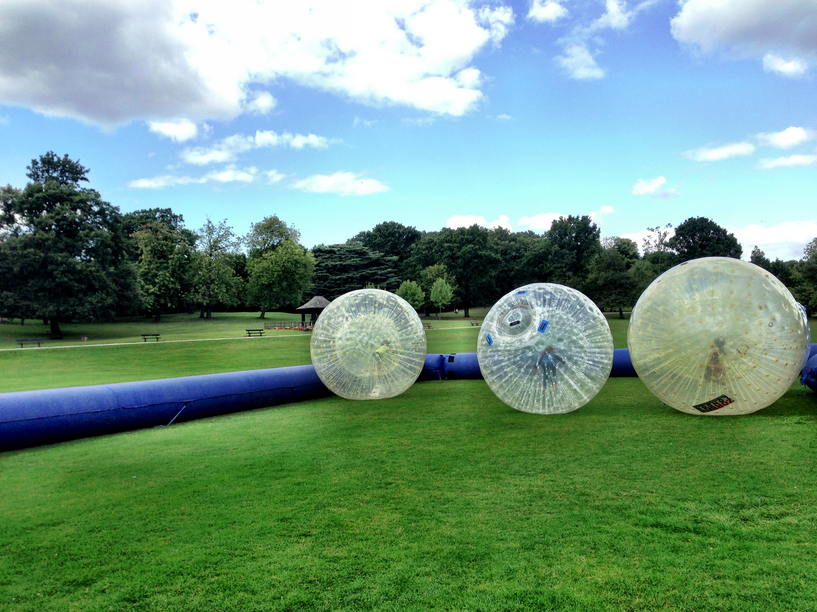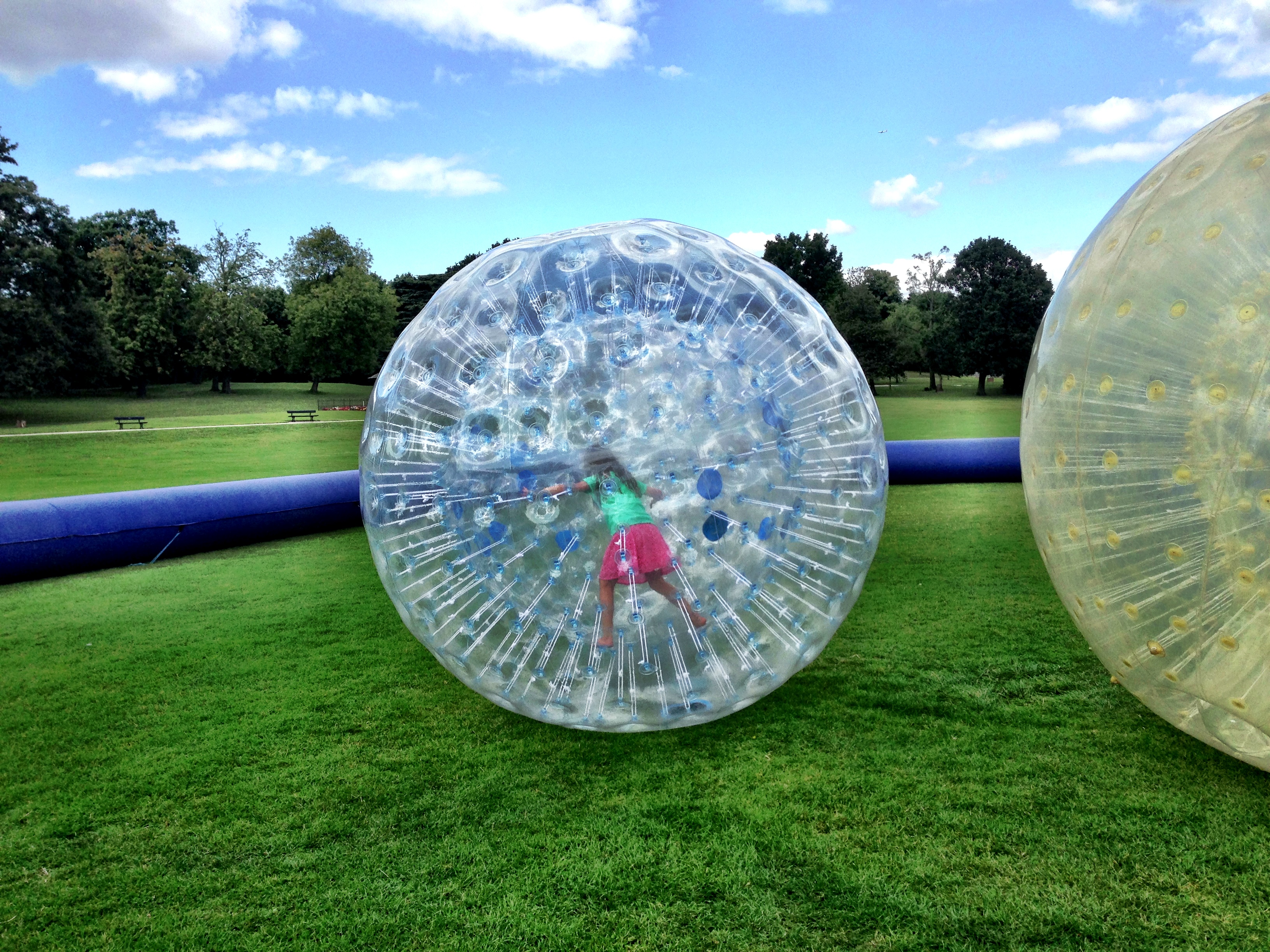 One of the best children’s day outs in South London is a trip to Crystal Palace..the train comes straight into the park, there are full sized dinosaurs (promise) a farm (open 12-4, closed wednesdays (made that mistake before..)) a playground..and a maze..and what’s more, it’s all free. There’s even a greasy spoon cafe for lunch…we went there with friends yesterday to find, much to our surprise, there was even more…the council had set up an adventure playground including zorbing..and that was free too!..happy days!