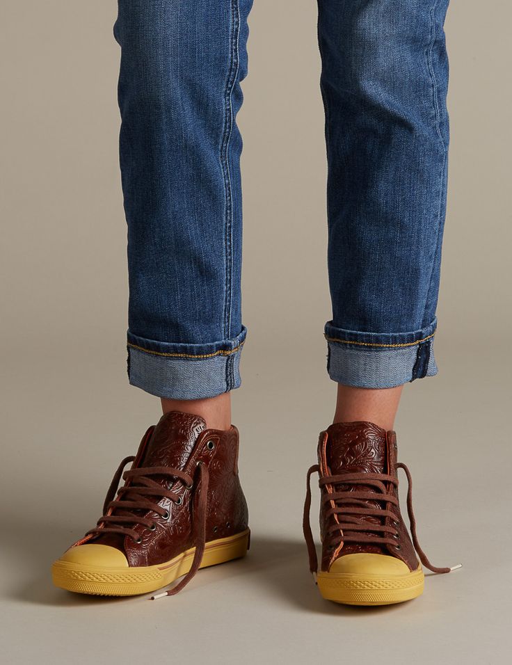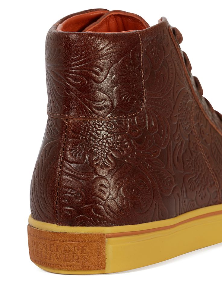 The perfect conker brown to match the season with authentically tooled leather, Penelope Chilver’s Barbarella Cordoban hi tops are the easywear anywhere shoe with that discerning level of quality and design.