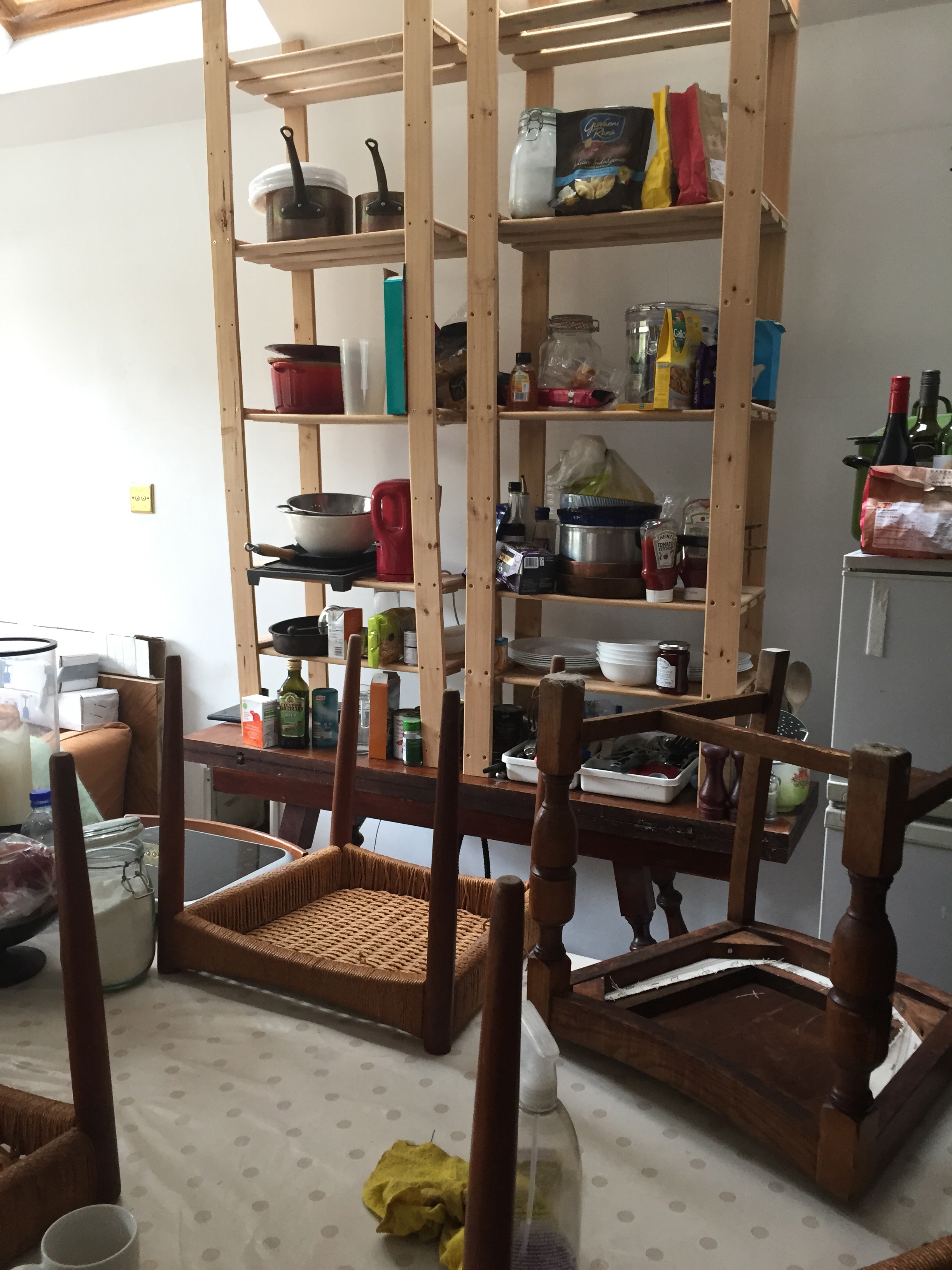 My kitchen is still a cunning arrangement of two bookcases salvaged from the cellar on a console table. The ‘oven’ (on the table to the left of the chairs) is a one ring hob..that only works with a le creuset pan. How middle class? The sink is in the shed..the washing up is the bathroom upstairs. Oh joy.