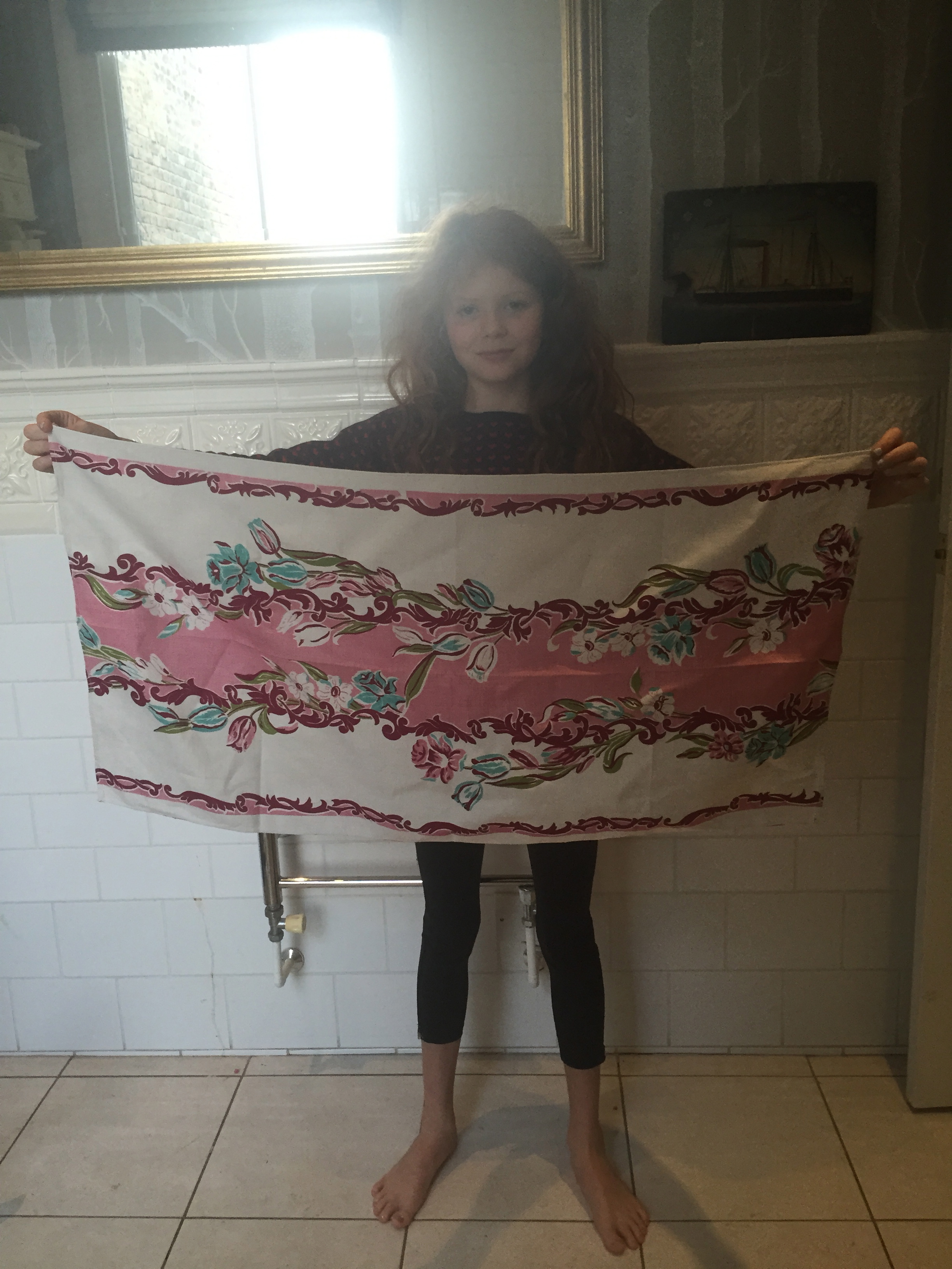 Thank you to Kerry for my fabulous vintage tea towel, as model by Bella in our temporary kitchen!