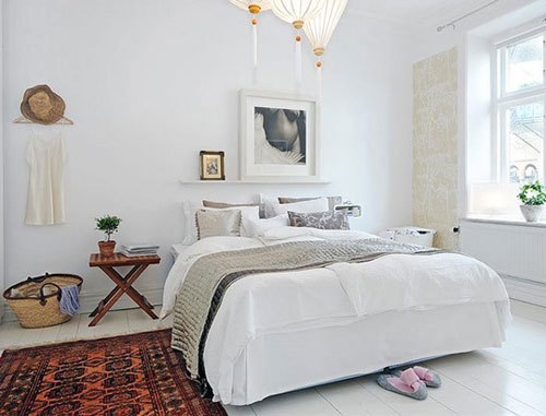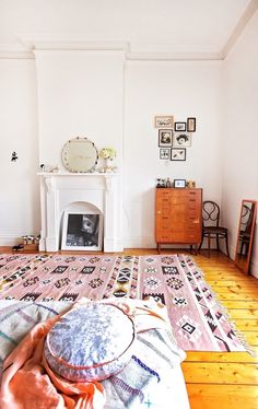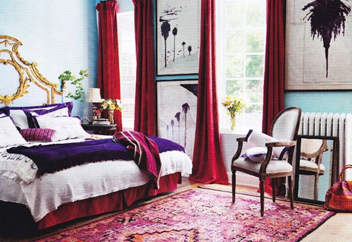 Headboard (still undecided), side tables (sort of there) and now thoughts for a rug: Since the advent of wall to wall carpets the rug has shrunk in popularity yet it’s design prowess can’t be denied. It adds warmth, colour, texture and interest like the tail feathers of a particularly beautiful bird of paradise. A rug, like the one above, can pull together two different pieces of furniture by linking them together on a shared bit of floor.