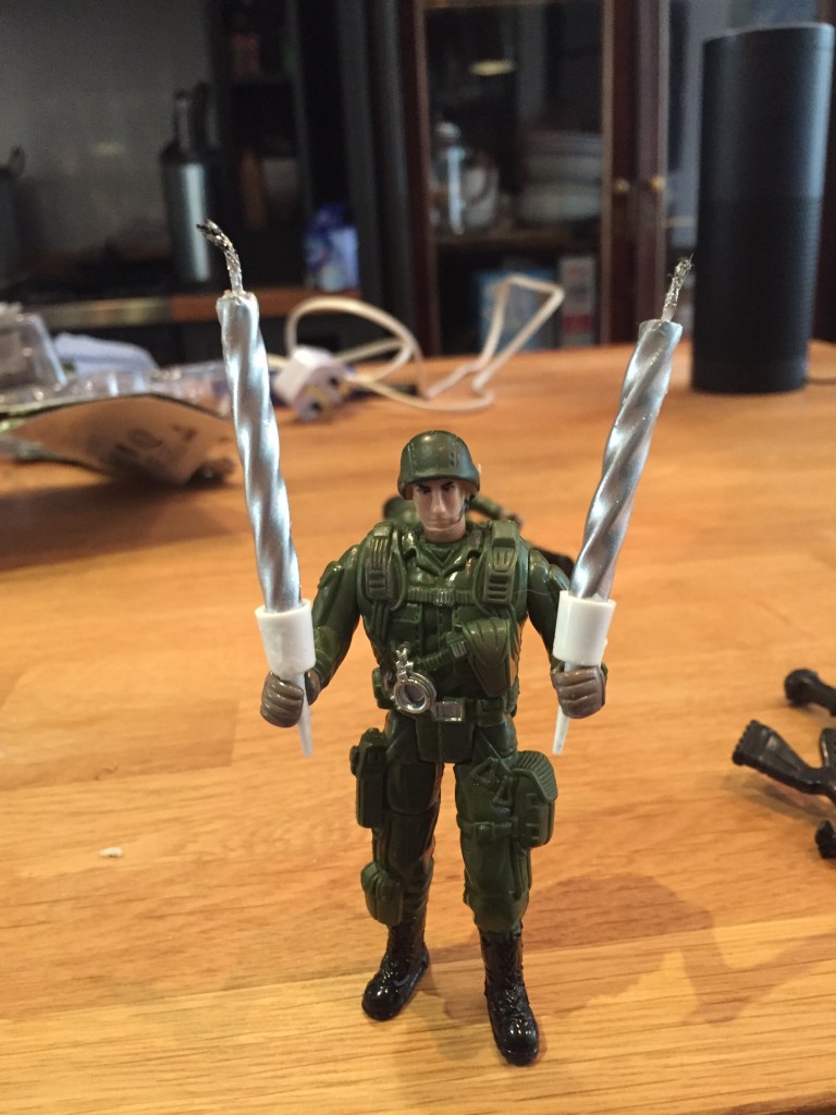 Charlie has a joint eighth ‘survival’ birthday on the Common tomorrow (I’ll be doing my sun dance once I’ve written this) (and stocking up on paracetamol/large flagons of alcohol). I saw these army characters in Poundland and thought candle holders!