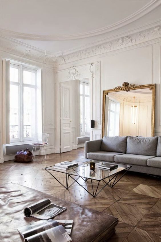 Sometimes it’s the big things that lift a room from the regular: glowing parquet floor, high ceilings, large windows and stunning plasterwork. The oversized mirror ticks the boxes too.