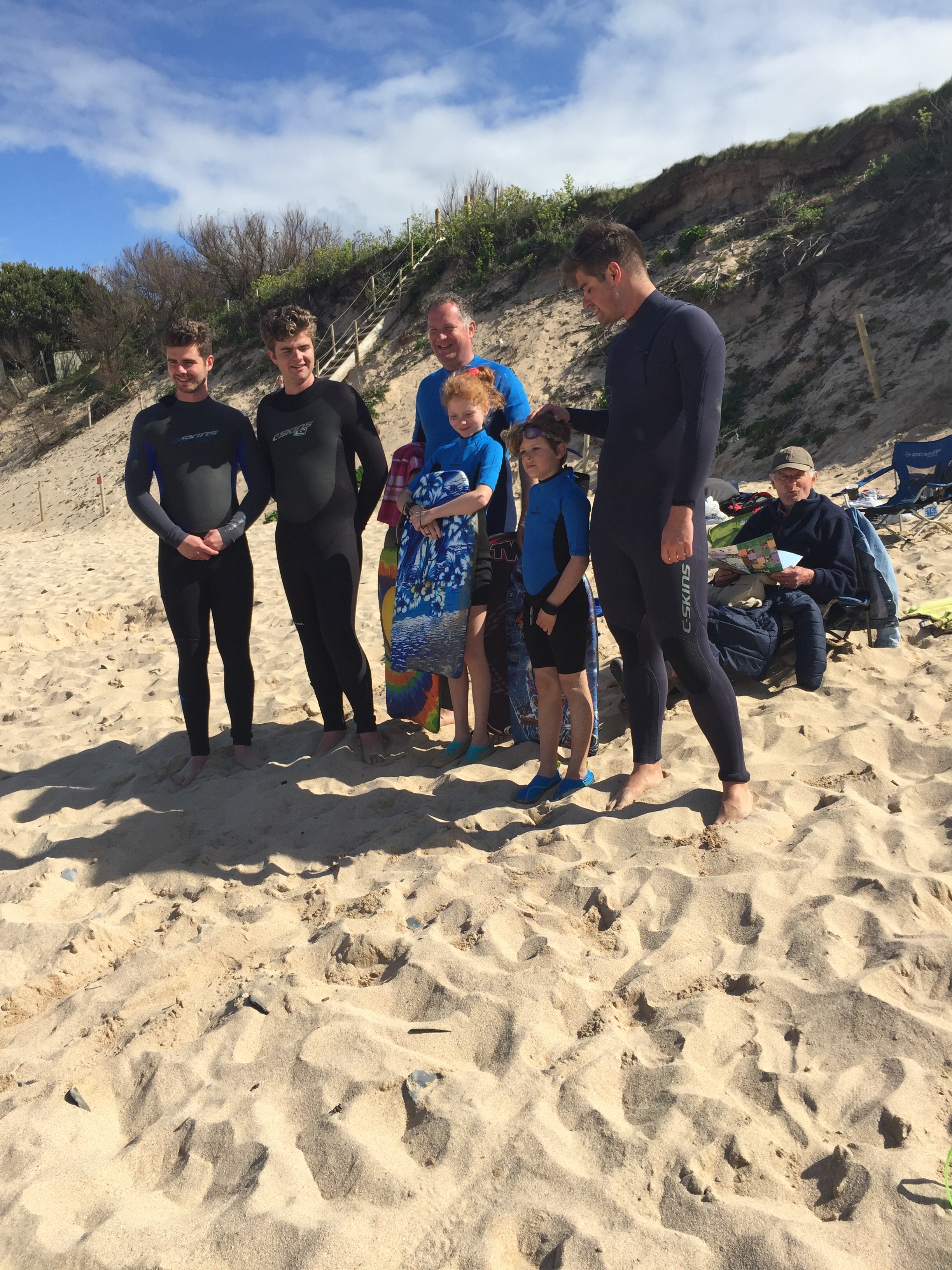 The surf gang preparing to face the waves. Note Grandpa Jack behind in three coats, hat..and eventually gloves!