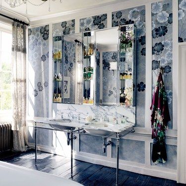 ‘Picture a summer night when it goes silvery-blue from the light of the moon’ Is how Kate Moss describes the inspiration behind the wallpaper for her bathroom.