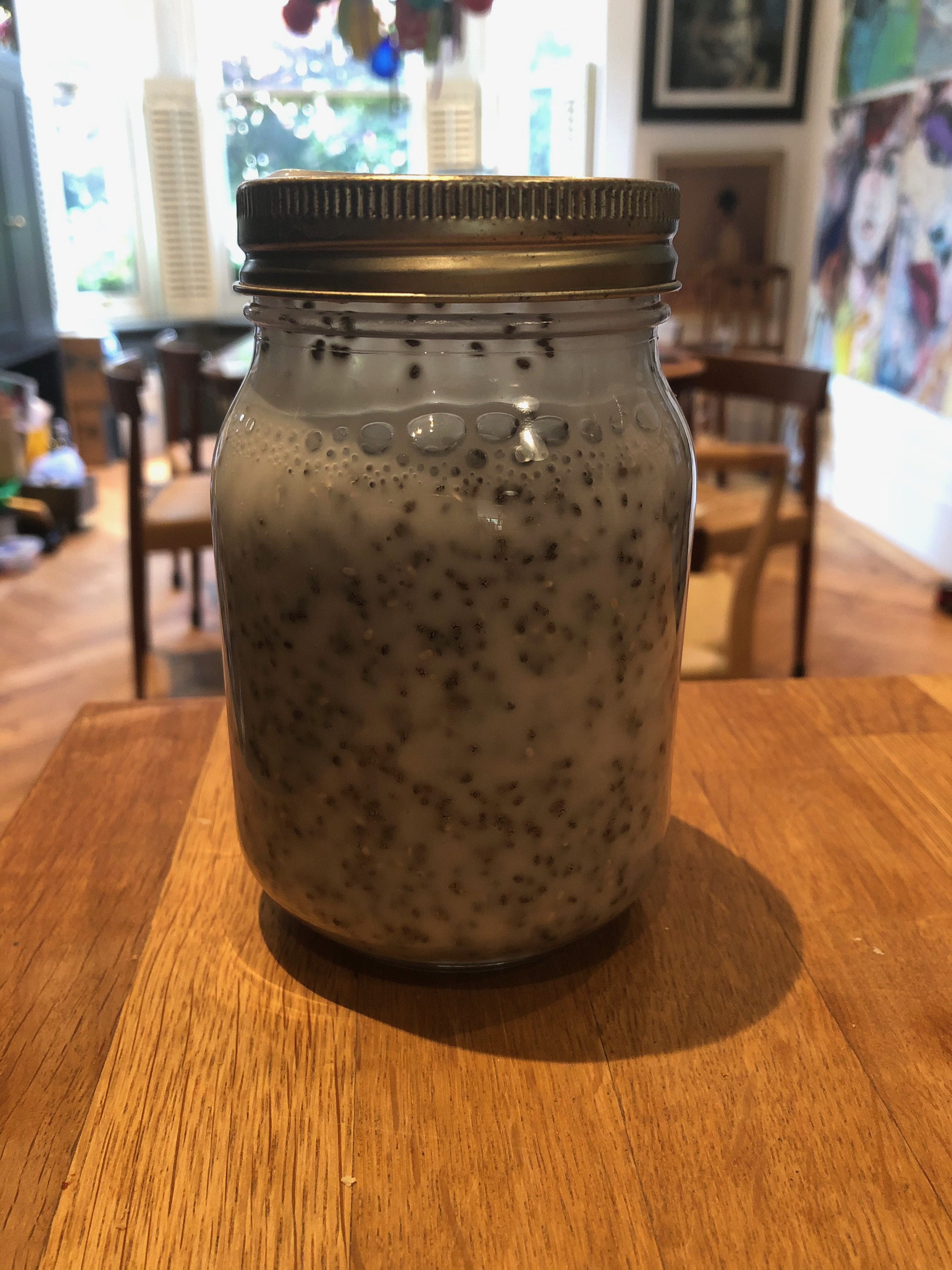 To make one kilner jar – or any other storage vessel – fill a quarter with chia seeds, top to the top with coconut milk and give a good shake. Some recipes then add honey or other sweetness – personally, I don’t need this.