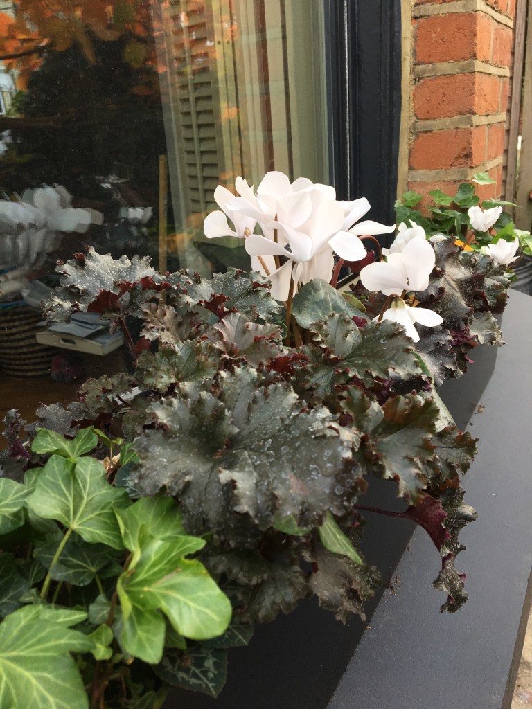 The boxes have been planted with ivy to soften and tumble over edges, heucheras for their colour and cyclamen as they were the only white plant readily available at this time of year. At some point trailing white geraniums will be added. It will be a pleasure to see the living wave of colour and white expanding and flowing out over the window sill. I’m even thinking about adding them to the first floor.