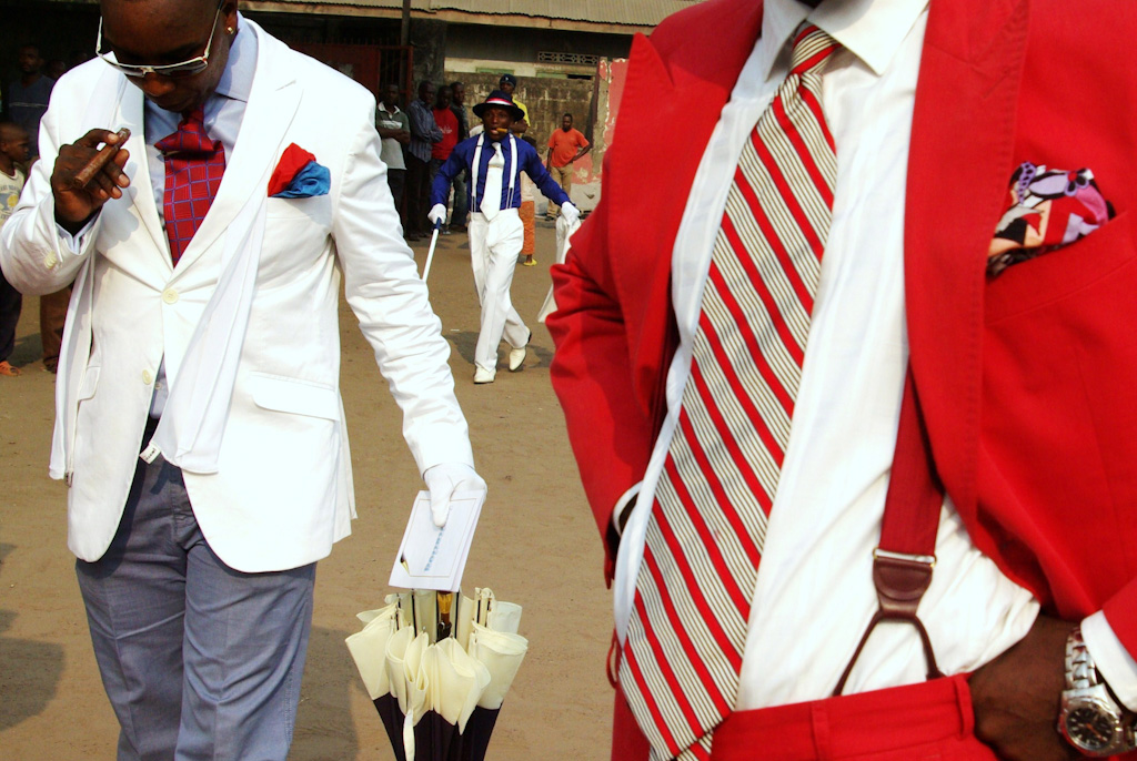 Mostly centred around Brazzaville and Kinshasa, the adjacent Capitals of the Republic of Congo and the Democratic Republic of Congo respectively, the Sapeurs cultivate their refined gentility amid their countries war-torn, extreme poverty.