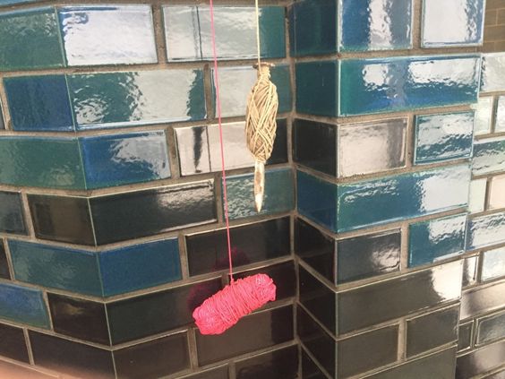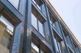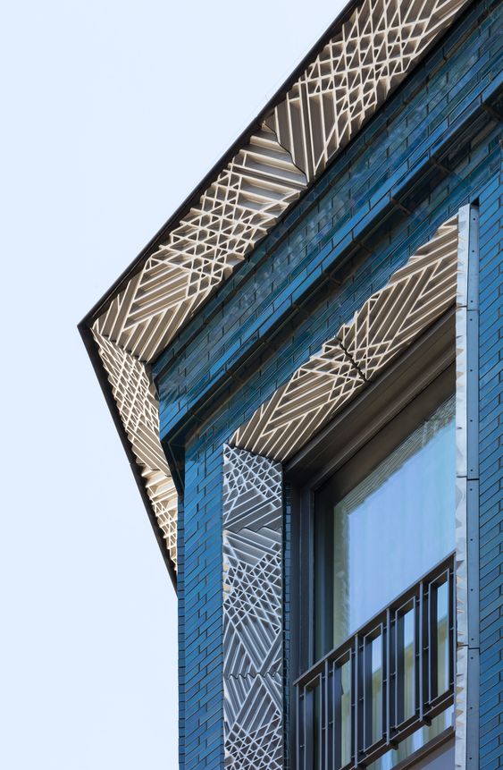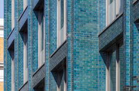 At the base, the hand-dipped glazed bricks are a deep blue, transitioning to the lighter blue as the building reaches higher.