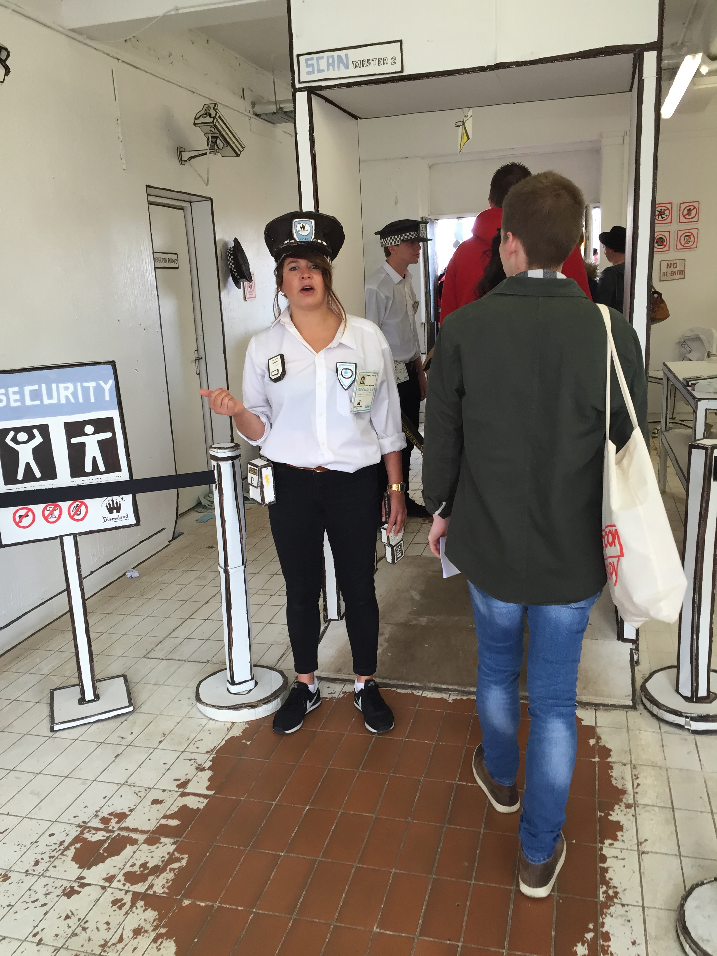 A play on double standards starts immediately, from the genuine bag search on the street (anarchy has it’s place, no spray cans allowed here) to the fabricated threat of Bill Barminksi’s cardboard screening room. What’s real and what isn’t?