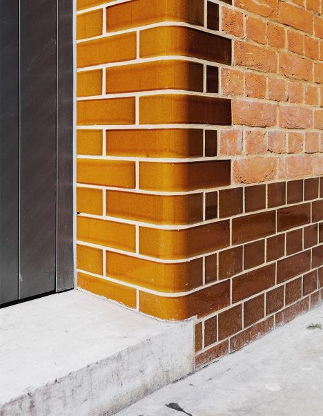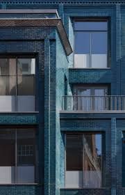 At the base, the hand-dipped glazed bricks are a deep blue, transitioning to the lighter blue as the building reaches higher.