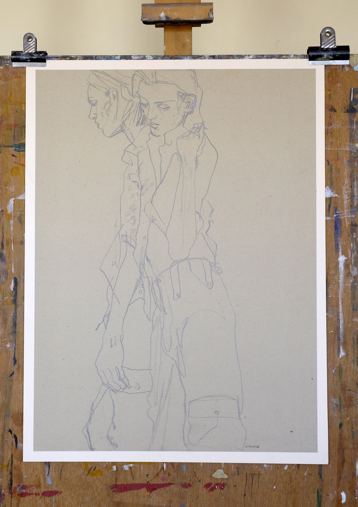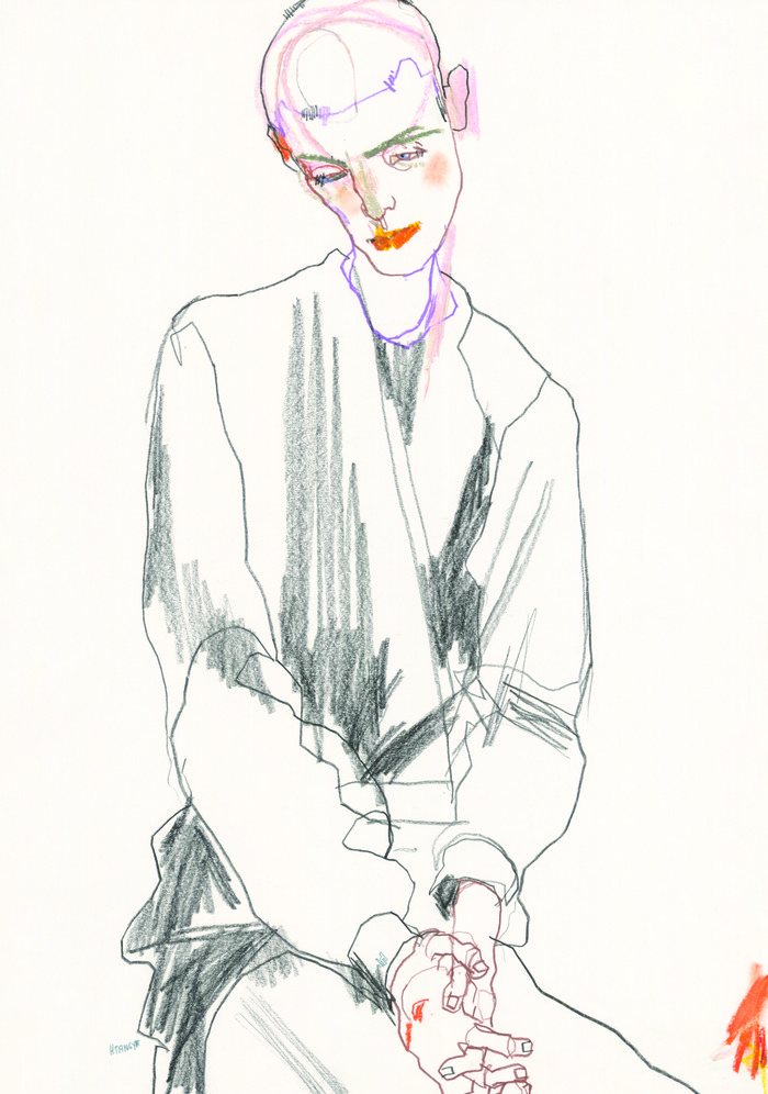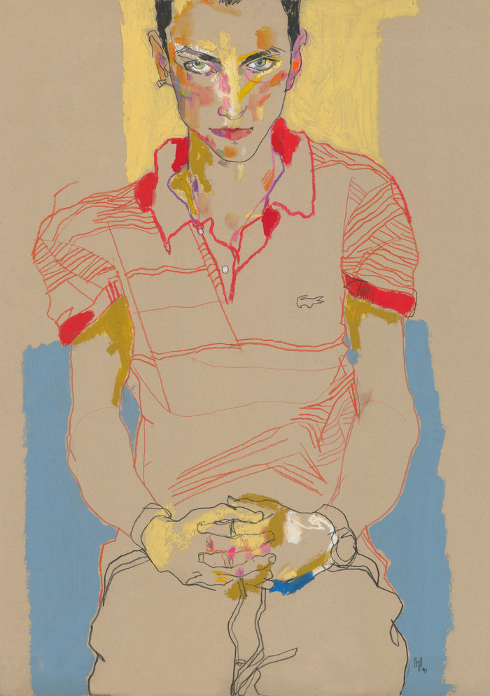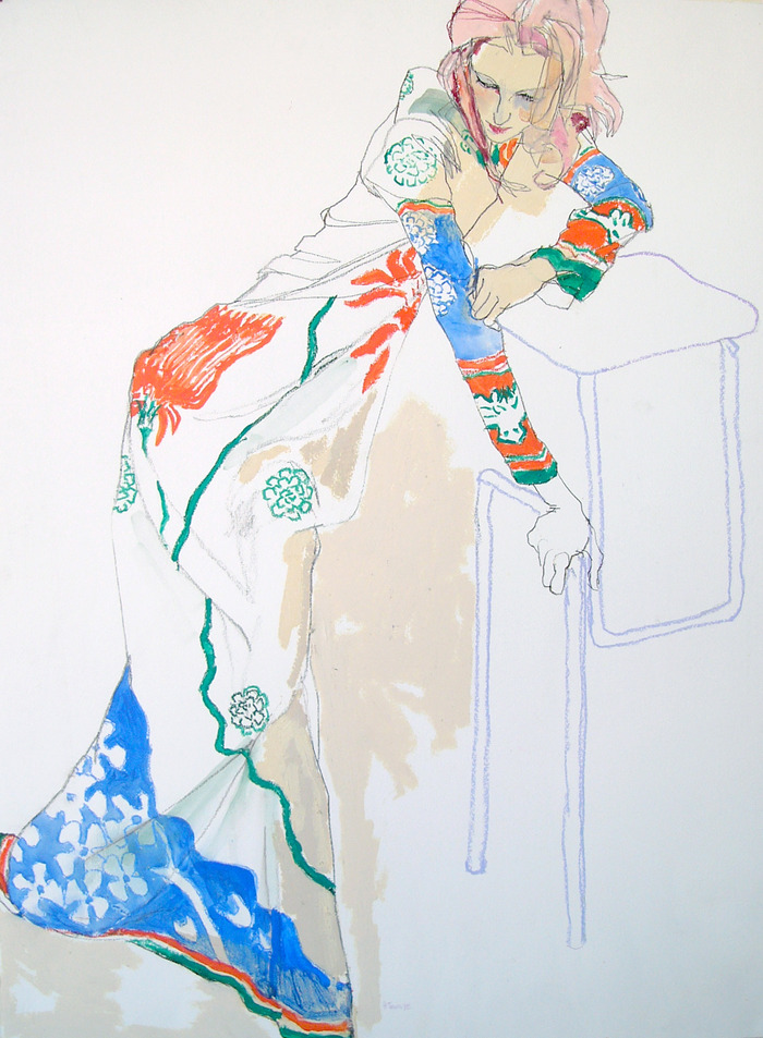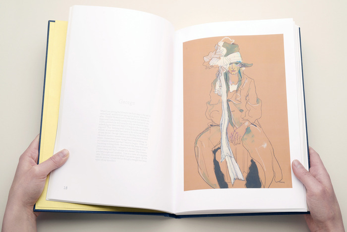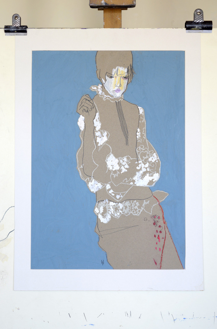 Whilst outwardly his professional emphasis has been on his fashion teaching, behind the scenes Tangye has been prolifically working on his own style of illustration capturing the clothes and his sitters in a unique and evocative way…It’s the confident, curling lines..the colours, the freedom..the skill.