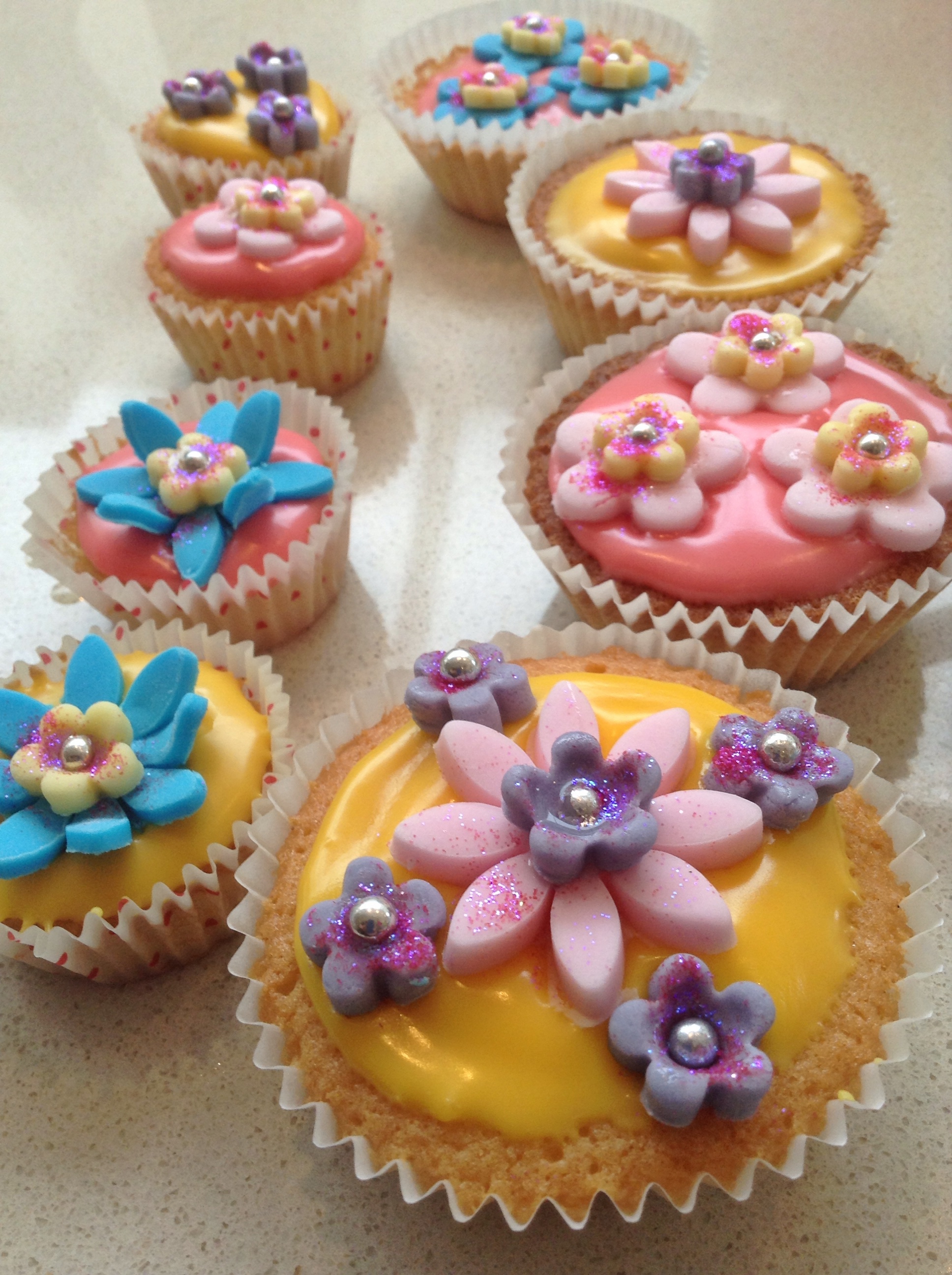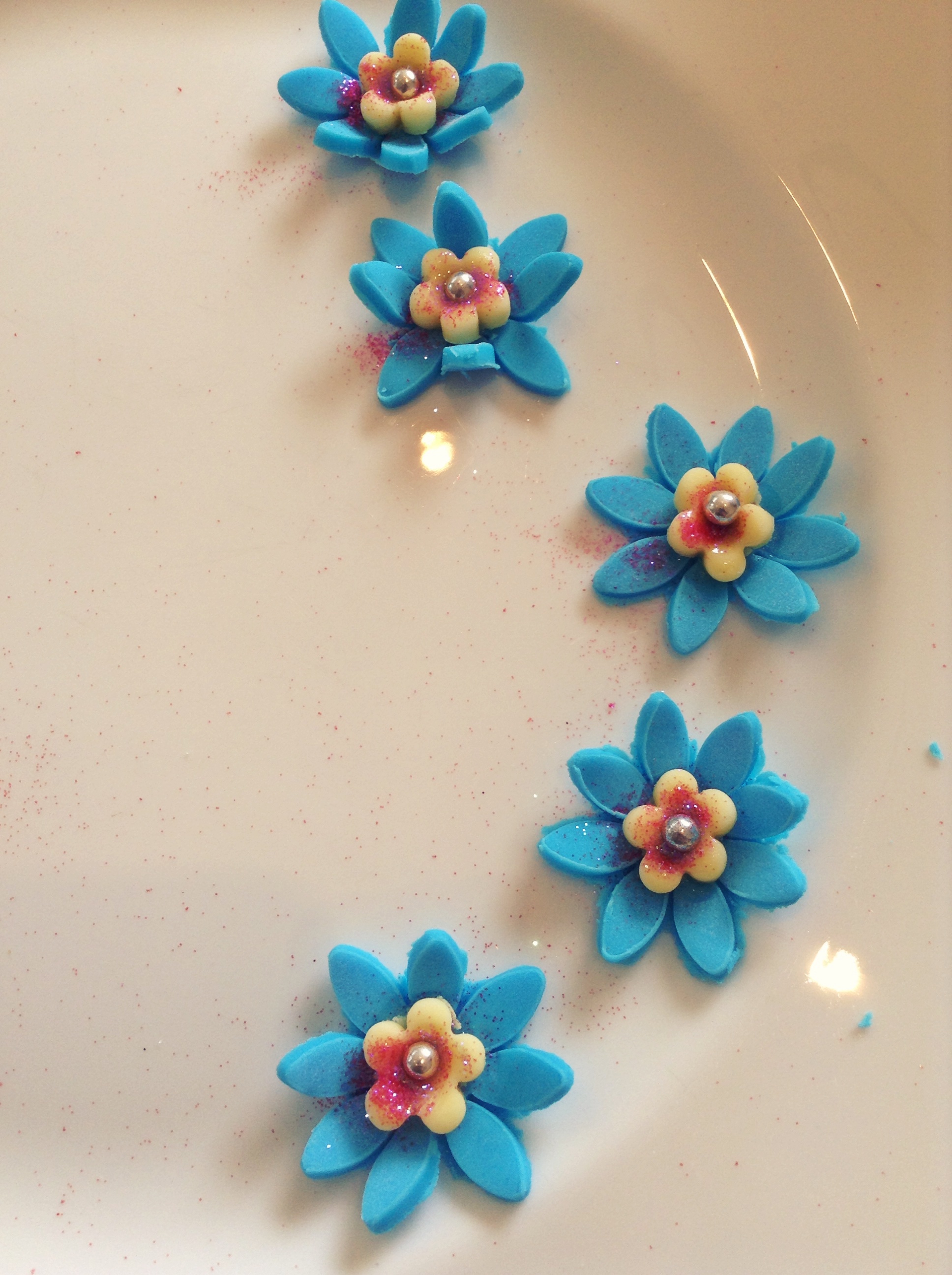 You thoroughly coat each petal – back and front – with egg white, then cover everything in sugar. A sprinkle of very fine glitter helps with the final fairy effect. Then they dry out and can be kept for months in an air tight container, ready for a dramatic flourish when required.