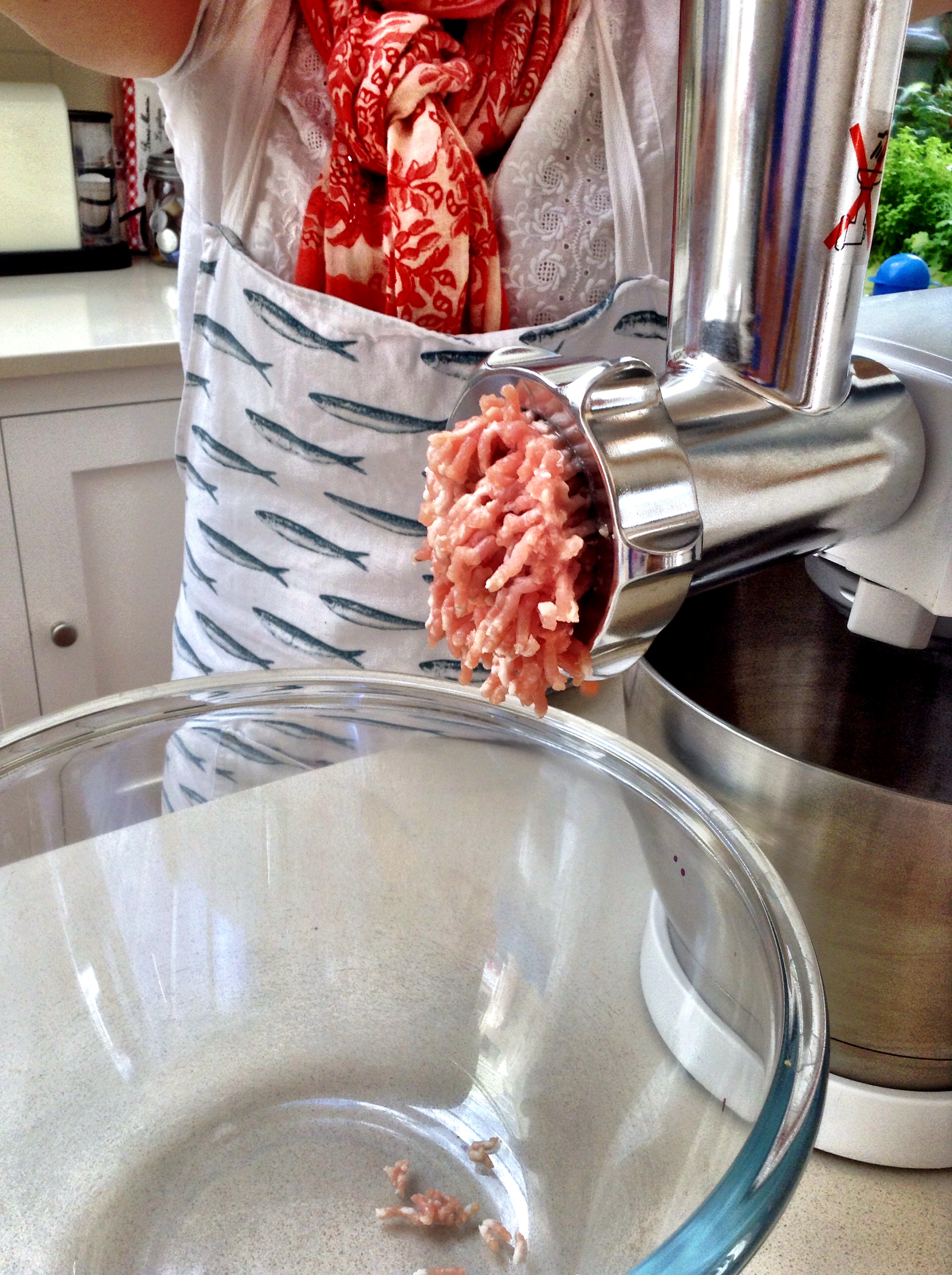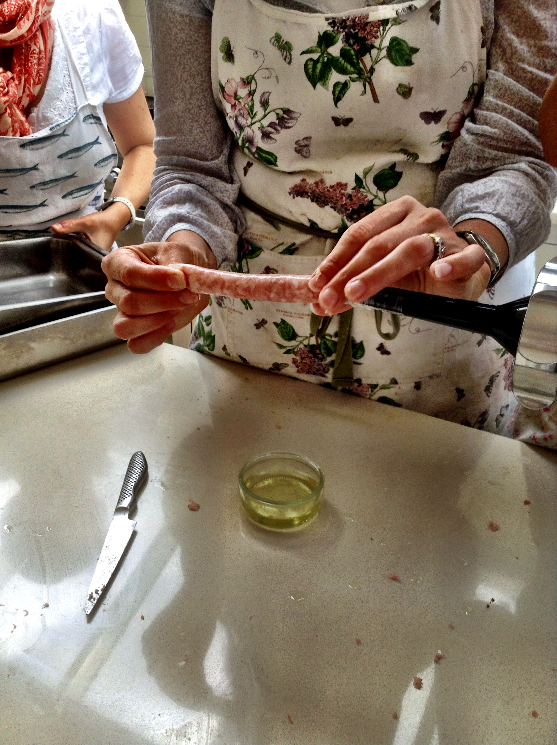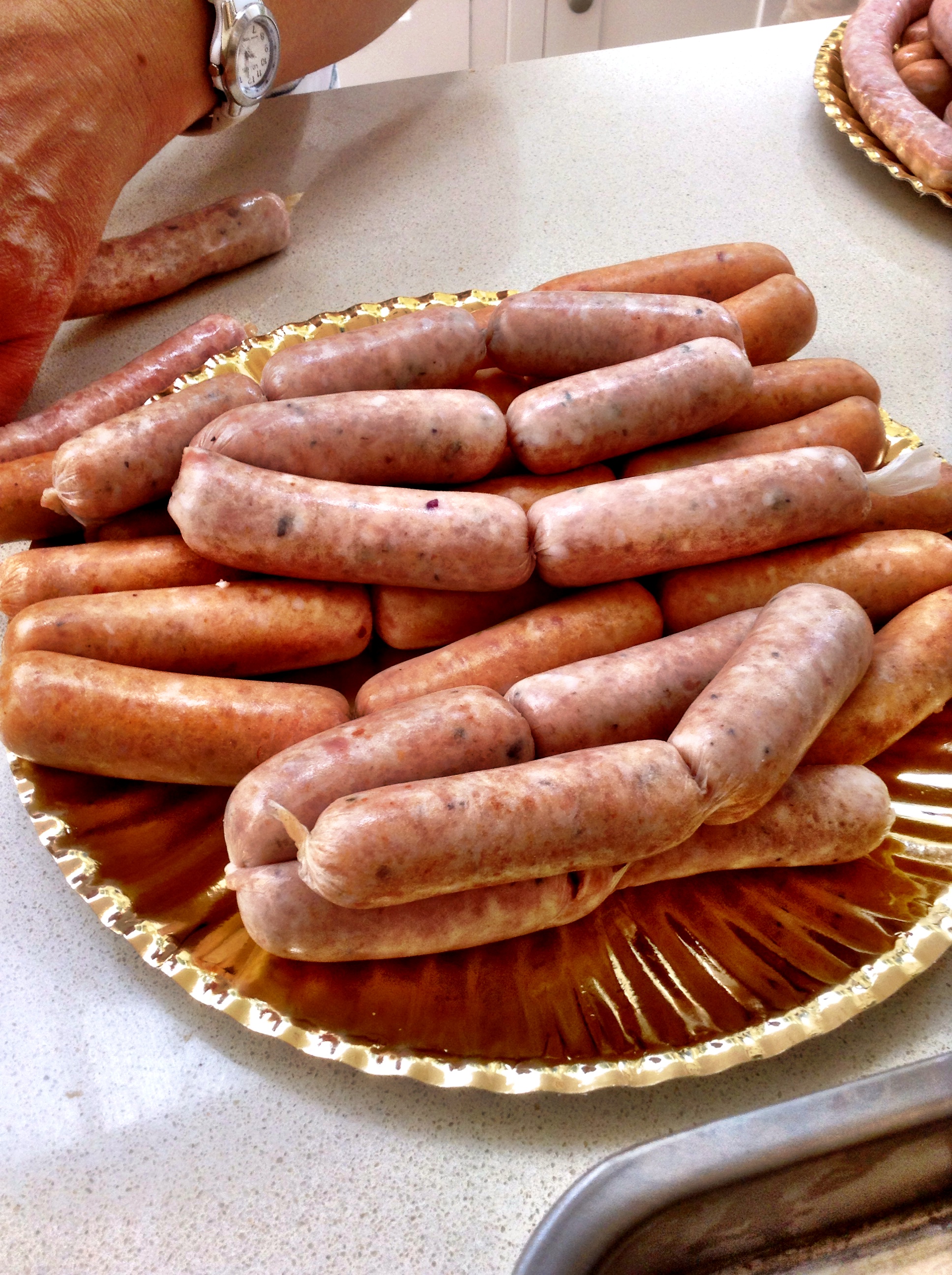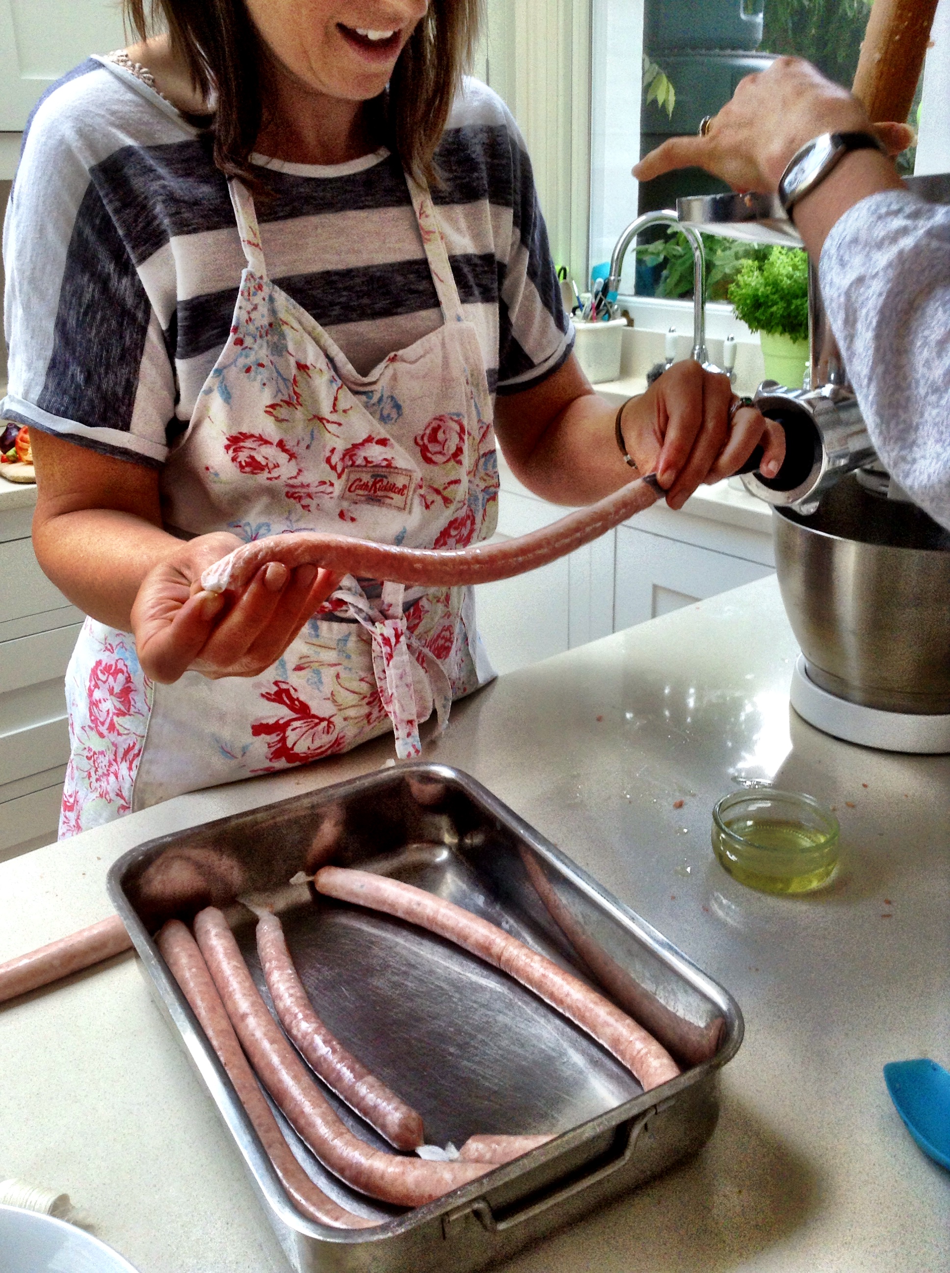 We made them right through from mincing the meat, adding bread crumbs and spices (for three different kinds of sausage no less) to the requisite comedy moment, complete with lubricating oil..