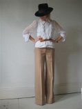 I am drawn to the proper flare/bell bottoms – and this is the perfect summer picture of desire – the way her trousers are deliciously skimming-the-ground-long and completely covering her shoes – which are probably a pair of wonderful Longchamp wedges subtly adding to height and length. Who can’t love that?
