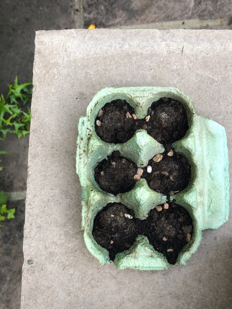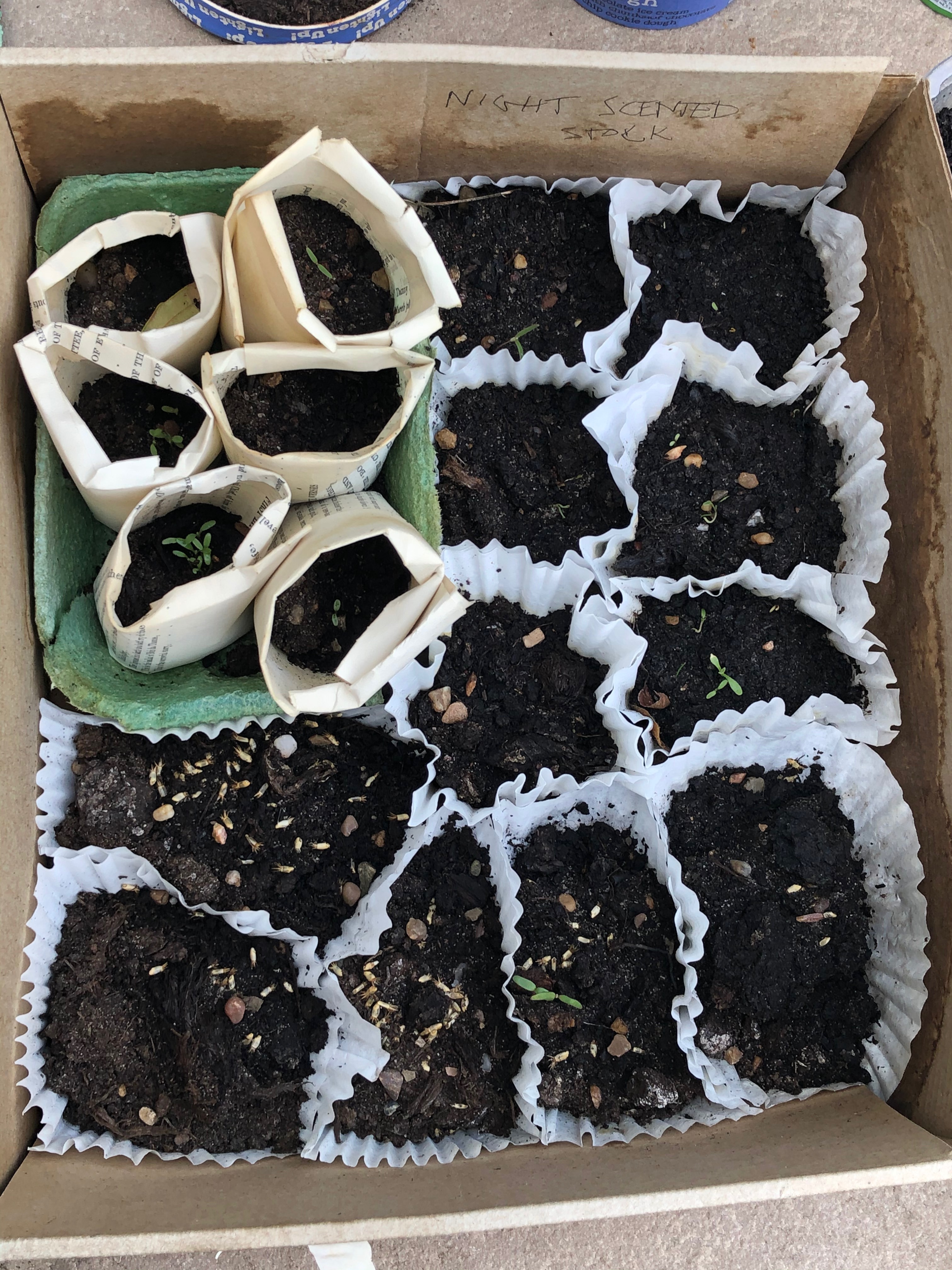 There were some casualties from the gale like winds of the past few days; the trachelospermem jasminoides (hark me!), the full grown version of the comb-over tree, has been pulled off it’s wall, and the wind did it’s best to destroy my seedlings, sending the ones in the egg box flying. I thought they were goners.