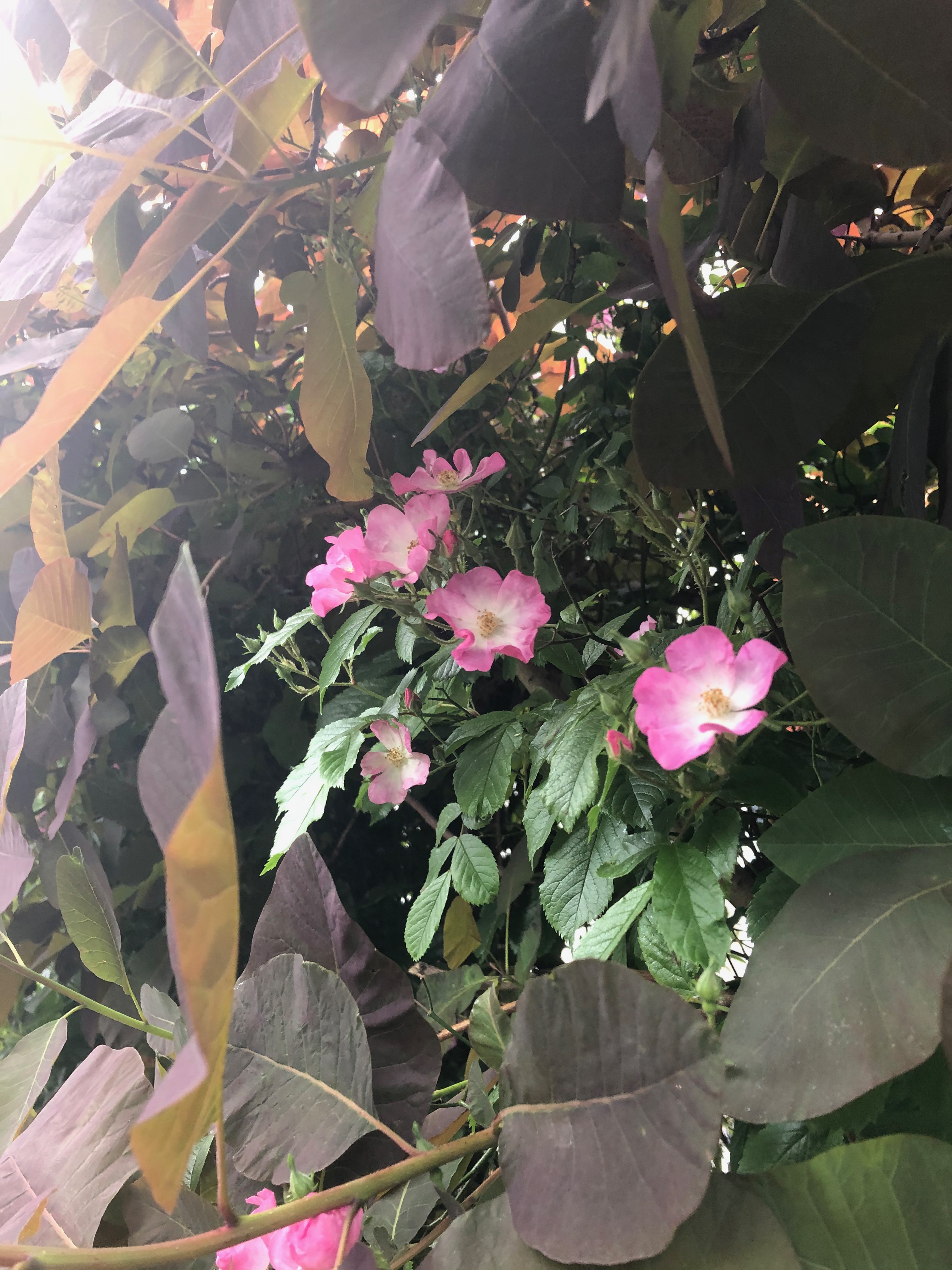 One of my favourite combinations – this pink rose against the dark leaves of the smoke bush.