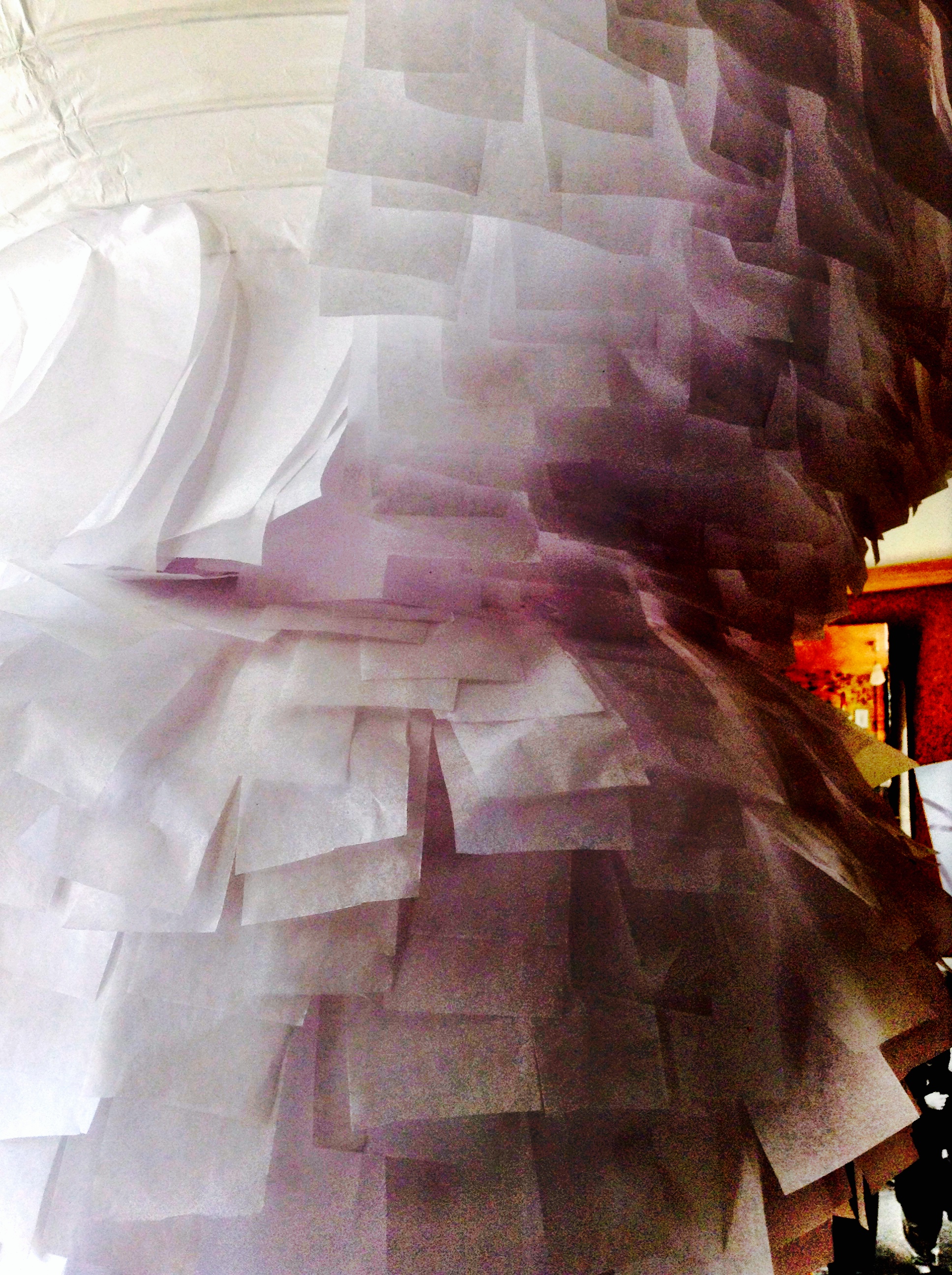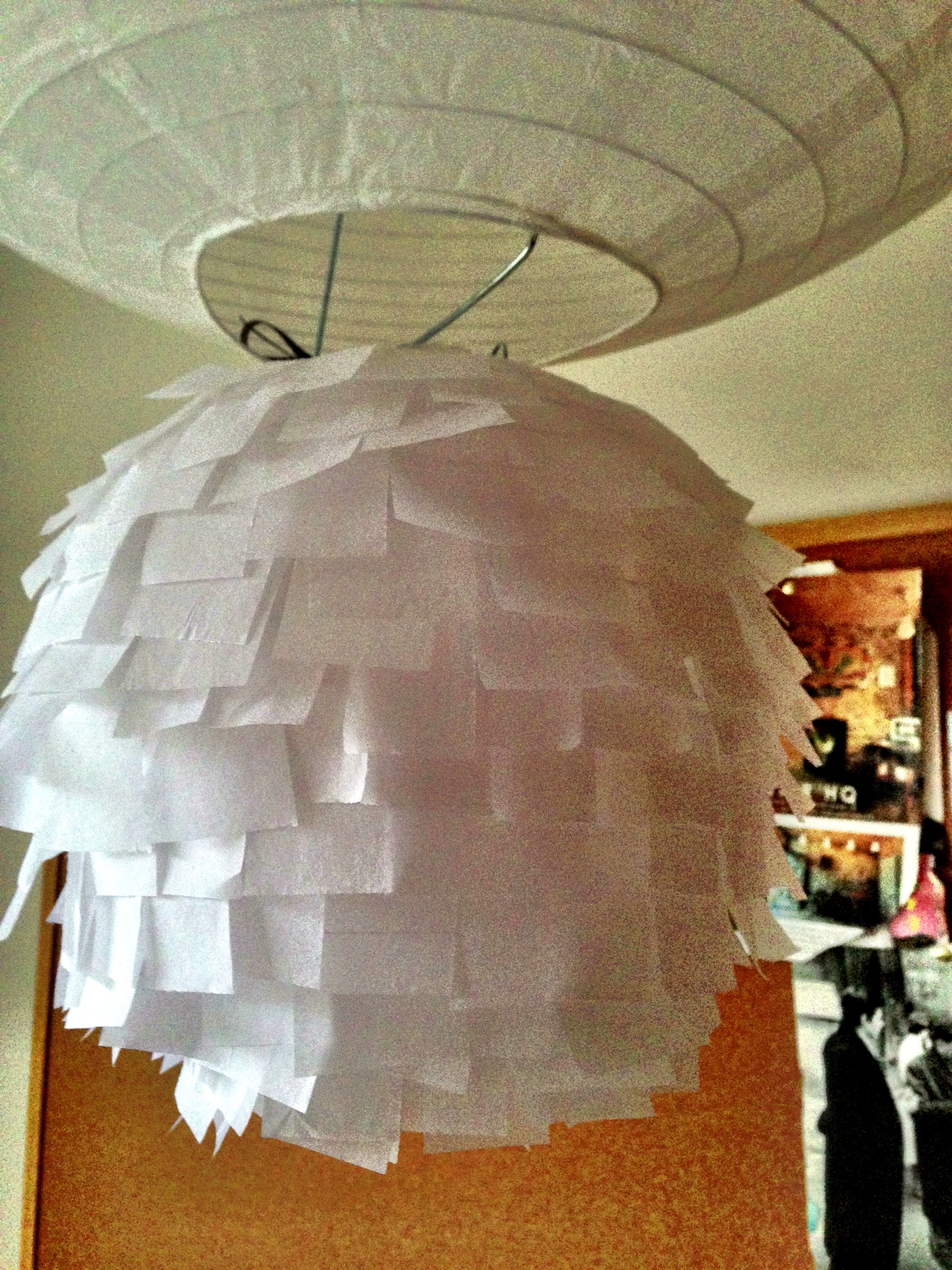The light (as discussed here and here) is coming on. I suspect my top shade is too big..but I just can’t stop! I love the way each shade eats up the shade below and covers the gap between them. At the moment they’re loosely hooked together – on the plus side it means they can be unhooked with the greatest of ease. On the downside you have to be careful to find the central point to keep them straight and balanced..and the slightest knock…..they all come crashing down…The window is open now and they do move most beautifully in the breeze.