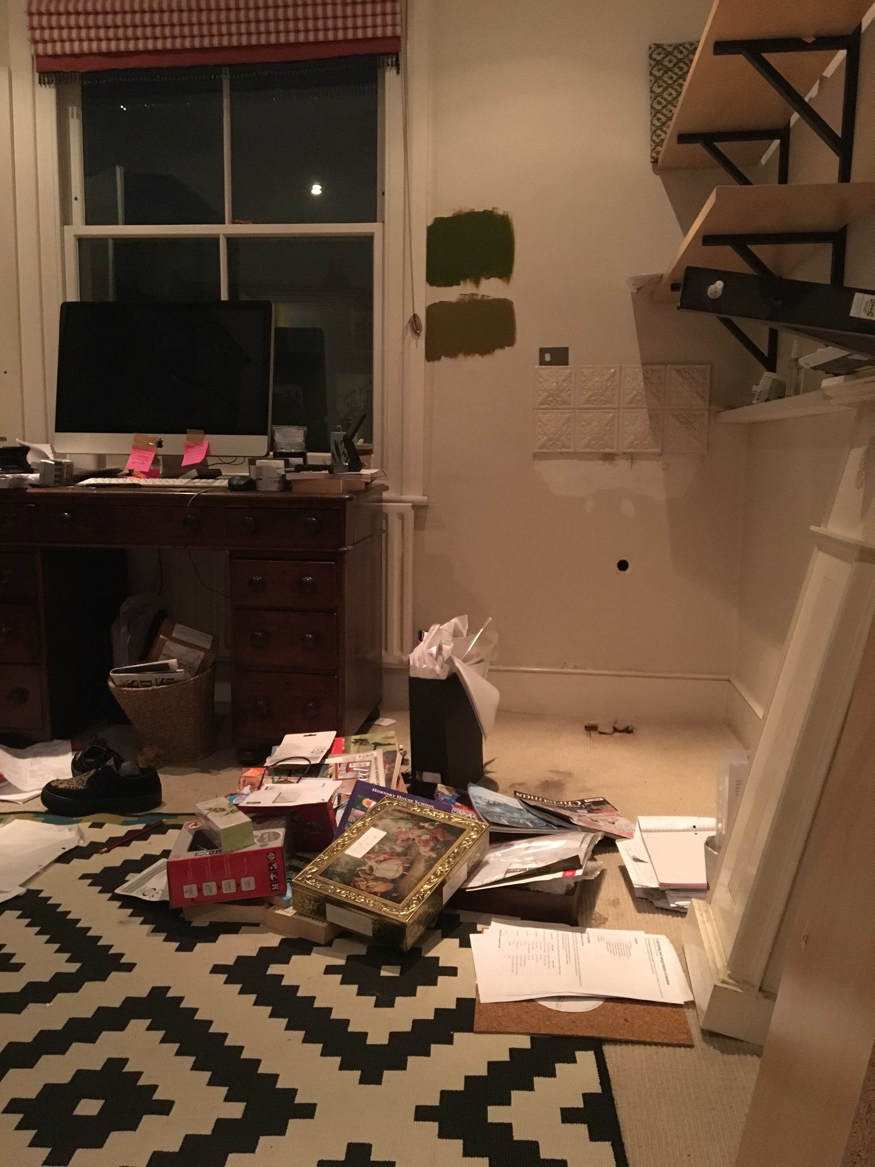 We’re in a little bit of chaos. Our lovely builders who did our kitchen texted on Monday to say ‘we have a slot free starting tomorrow, so would you like us to do all those other little jobs you’ve made a list of?’ Which is great in one way, because we were just about to decorate the study (although we were in that phwoo phwee stage of ‘should we do this just before a Christmas that we’re hosting? It’s going to be tight and I’m not sure if we should lose the present cupboard just yet’)…Except they will help make the study really special by fitting the fireplace, making new shelves and giving us the kick up the backside to get started. It was panic stations yesterday.
