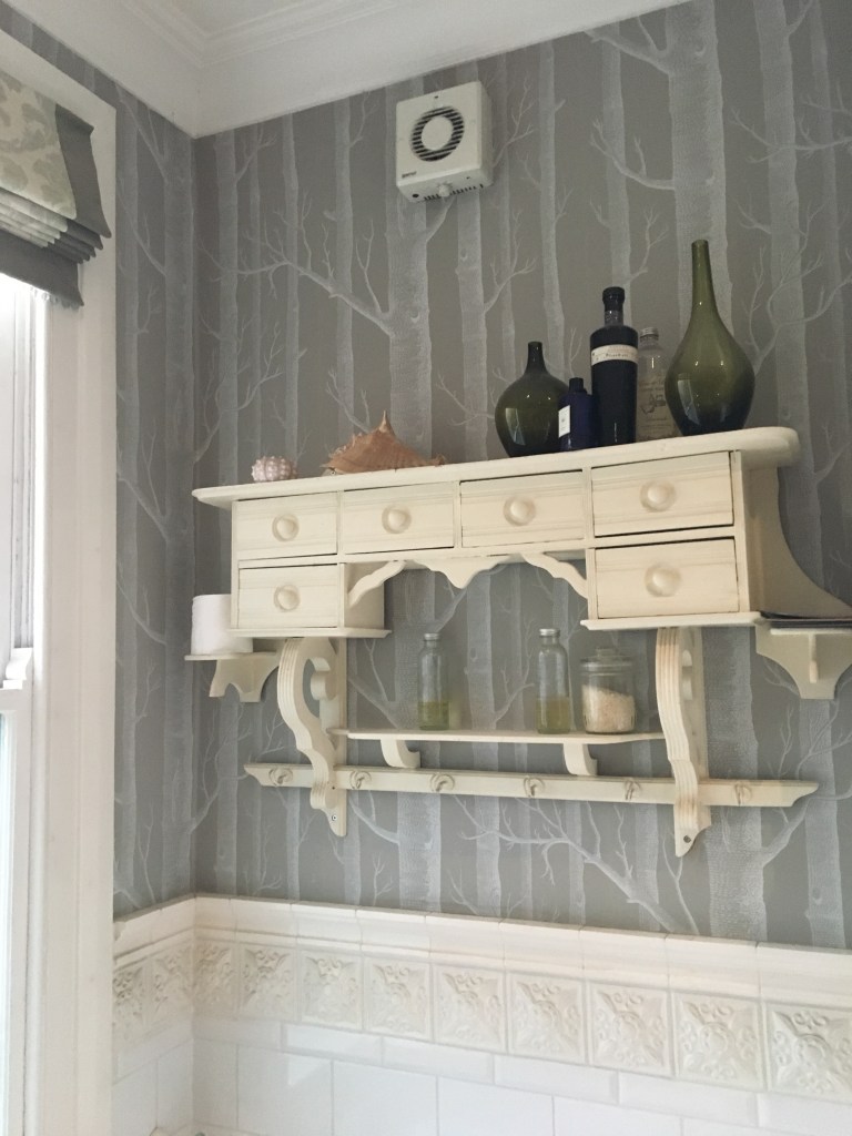 First step was a deep clean of the tiles. Vinegar, though powerful on the nostrils did the job. A little bit of re-grouting was needed – and then I was going to dye the grout a dark grey, but I was concerned the new grout was of a different consistency – less chalky, more rubbery so would they dye the same colour? It was an easier decision to not risk it. Besides the new pristine white of the tiles was impressive. Finally, paint – white on the ceiling and the Little Greene Paint Company’s French Grey Dark on the woodwork which is a soft, pinky grey that seems to blend with any thing. A continual stream of Radio 4 plays on the ipad helped the process along..
