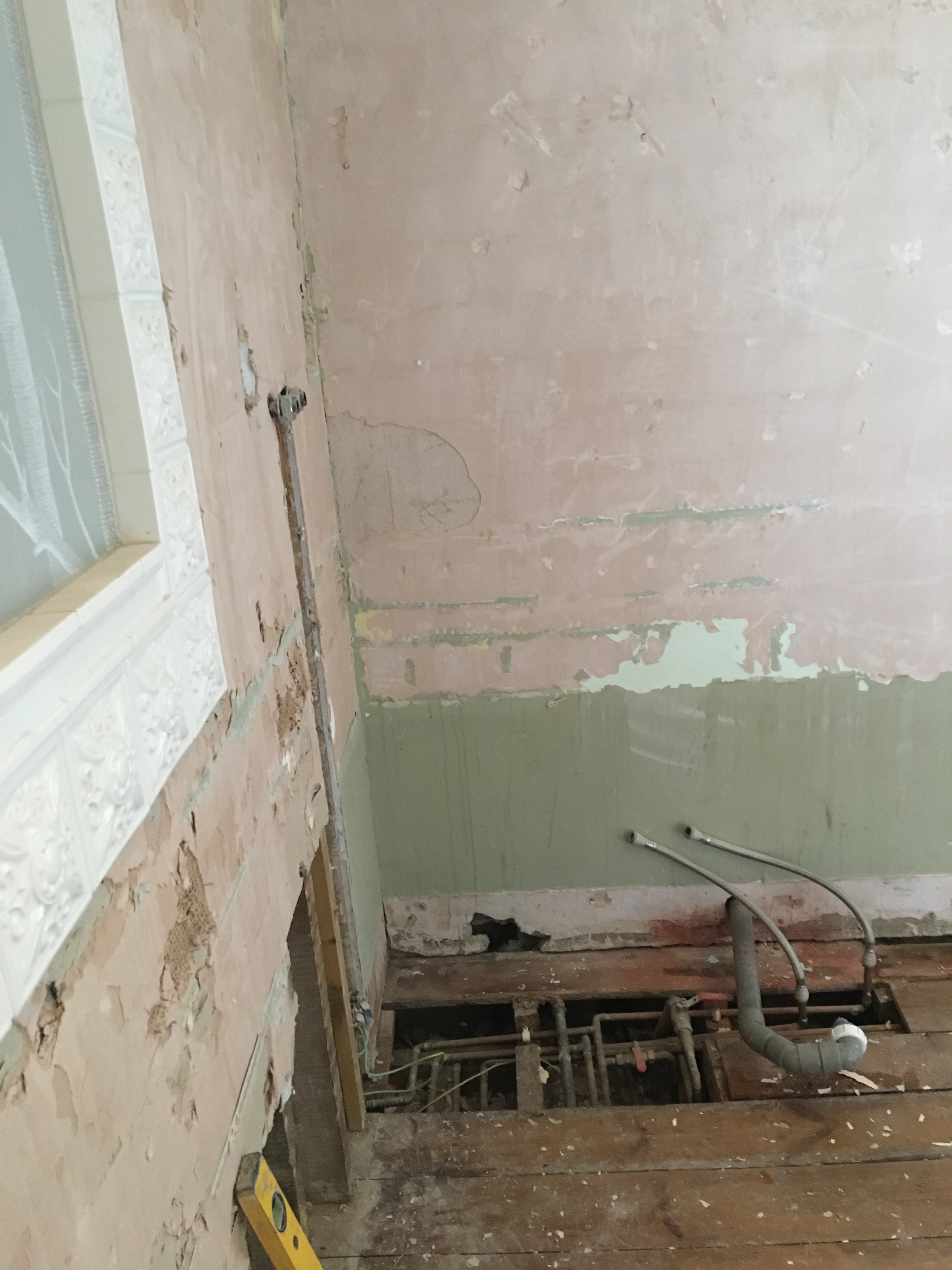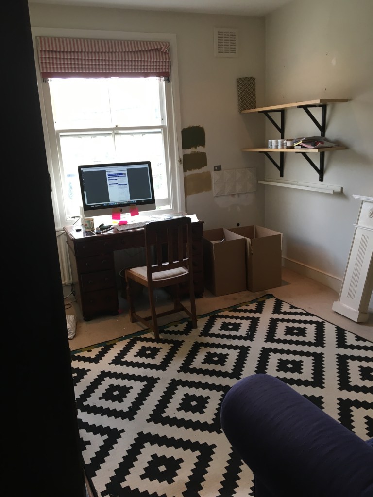 This is the best before photo – taken a little late, when the room has already been partially cleared, but it gives a sense of the layout. On the left, slightly blocking the photo is a big, black glass fronted bookcase that held an enormous amount of precious crap. The idea was to open up the room by moving it to the right hand corner by the desk, allowing in more light. This meant that both the shelves had to move and we finally had to sort out the pipes and tiles left by the ghost of a sink: When we first bought the house, this room was our kitchen. It’s next incarnation was nursery and finally study. The sink was from the days of nappy changing and bloody useful it was too. The carpet was the first we ever laid in the house – just a week before Bella was born to celebrate it’s transition to nursery. Unfortunately when I went into labour and disappeared to hospital, Molly the dog had the raging squits all over it and it never quite recovered…in truth it was a joy to rip it up and take the room back to bare floorboards. The fireplace surround, leaning against the wall was going to go where the bookcase was, with a mirror on top to bounce light..important as this room was going DARK!