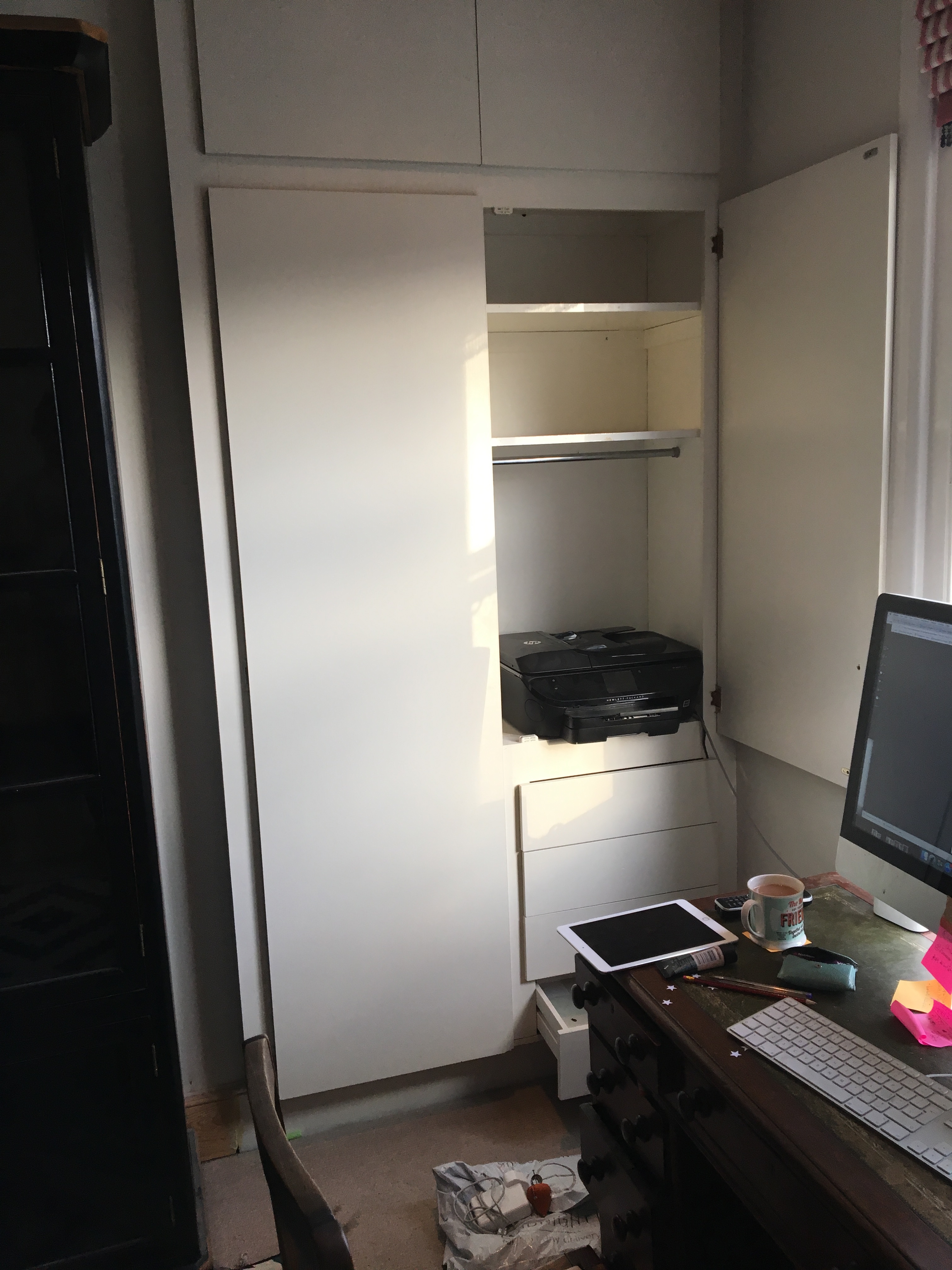 The other problem in the room was this cupboard – the only original cupboard left from when we bought the house nearly 15 years ago. Originally part of the kitchen (although you can still see the wardrobe rail from it’s days as part of a nursery) We now use it as a present cupboard, to store printer inks, paper and the printer. Except the the space is terrible for storage and printer didn’t fit so the door was permanently open…
