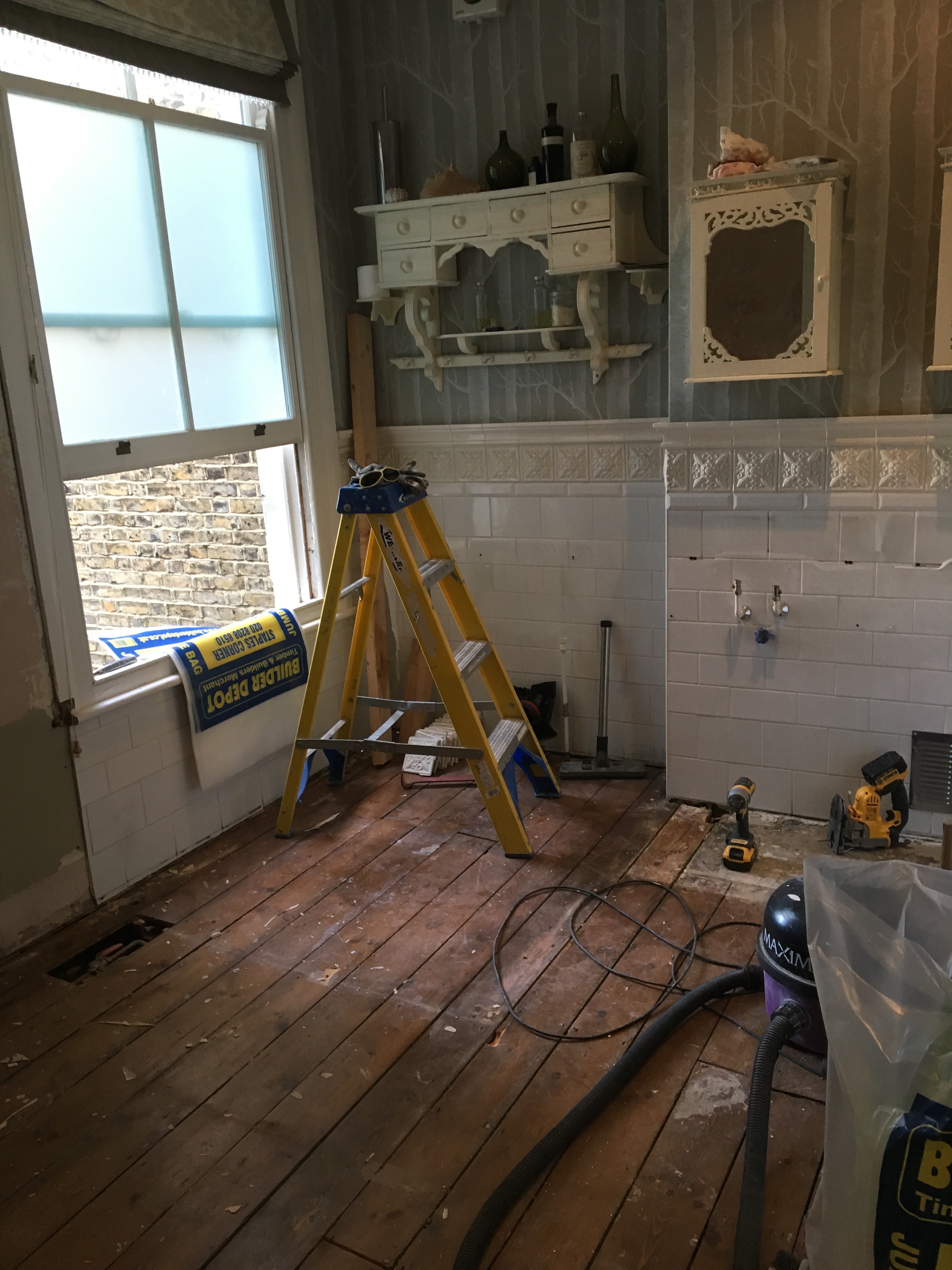 Interesting fact: Six different tiles have been used in the making. It adds a certain charm. The marble tiles were from Topps tiles and were cursed for being of different thicknesses – it’s taken longer to get them up and they are darker than they look on the website, but as they actually match well with the wallpaper it’s been a win. And the price point – £49.93 precisely a sqm made them the obvious choice: A compromise on pushing the budget on a smaller area where the hit is less but the effect is more. Now work is starting on the floor.