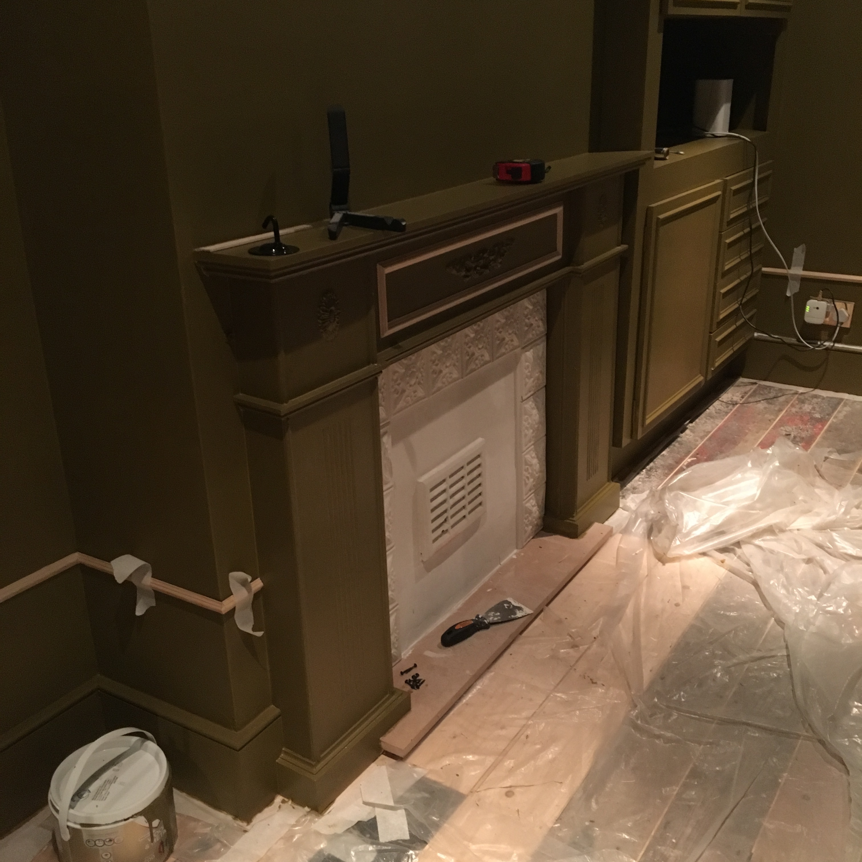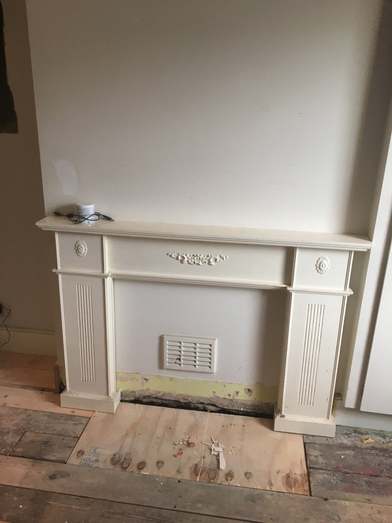 First step of the renovation: pulling up carpet and fixing the new fireplace surround, bought for a very pocket pleasing 99p on Ebay.