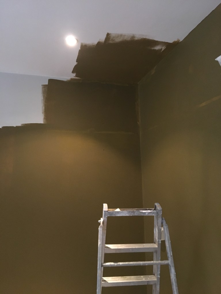And now for colour…shit brown with a hint of green! Interestingly it comes out more green in the photos. I will confess it was scary painting it on for the first time, particularly with memories of this paint in mind – and it’s the first time I’ve painted a ceiling dark…terrifying…I really didn’t want to have to paint that white again!
