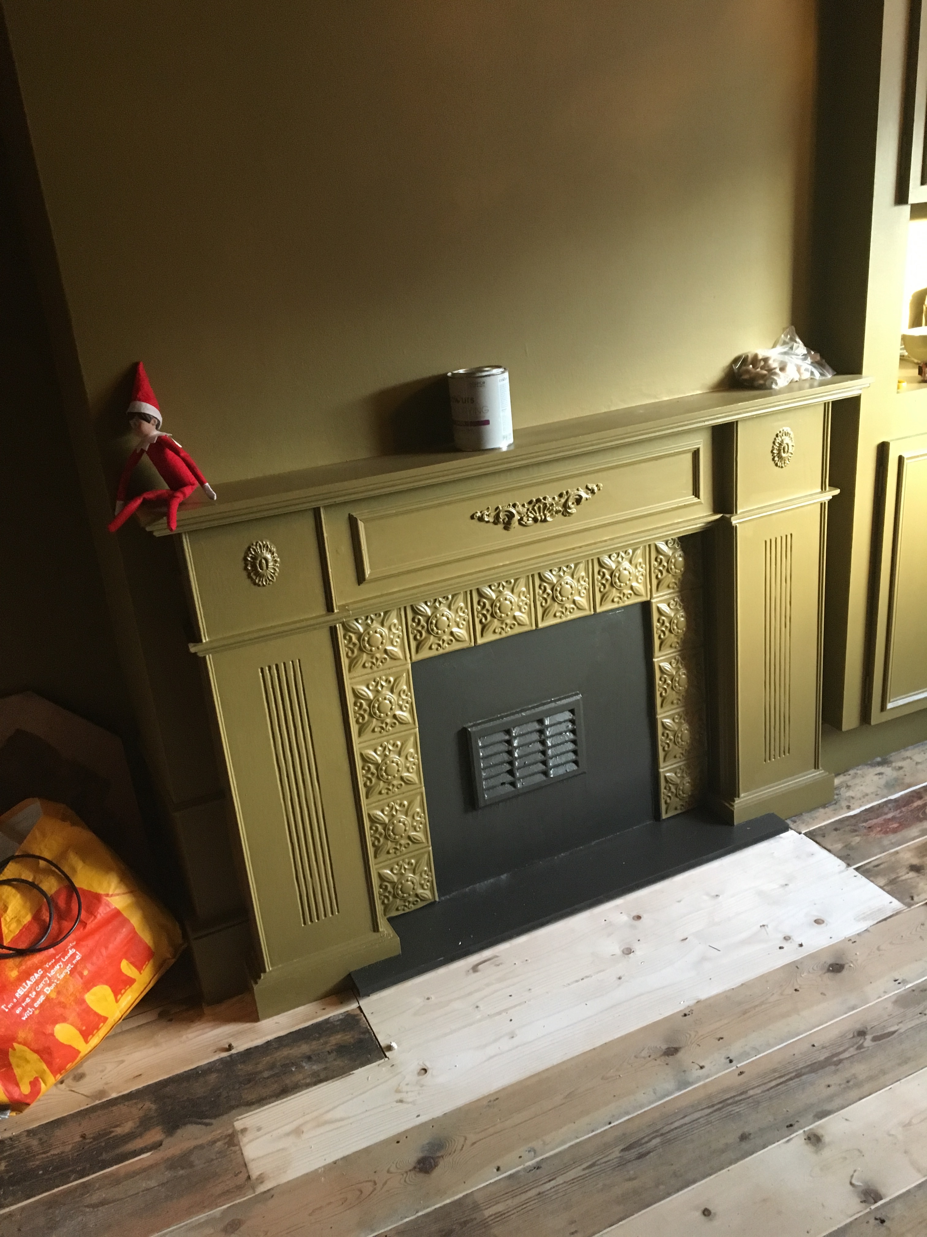 Then everything – and I mean everything, was painted. Recognise the inlay on the fireplace? Came from the tiles on the wall from the ghost sink…all cunningly recycled.