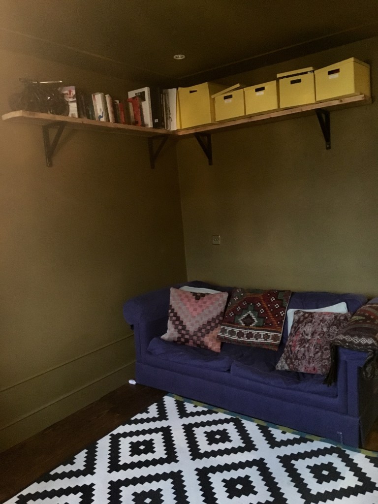 On the other side of the room, the shelving is much better positioned and the sofa bed is back in: The blue sits very happily with the shit brown. Not only is it a great place to read a book, it gives the room a double function if we ever have extra guests coming to stay.