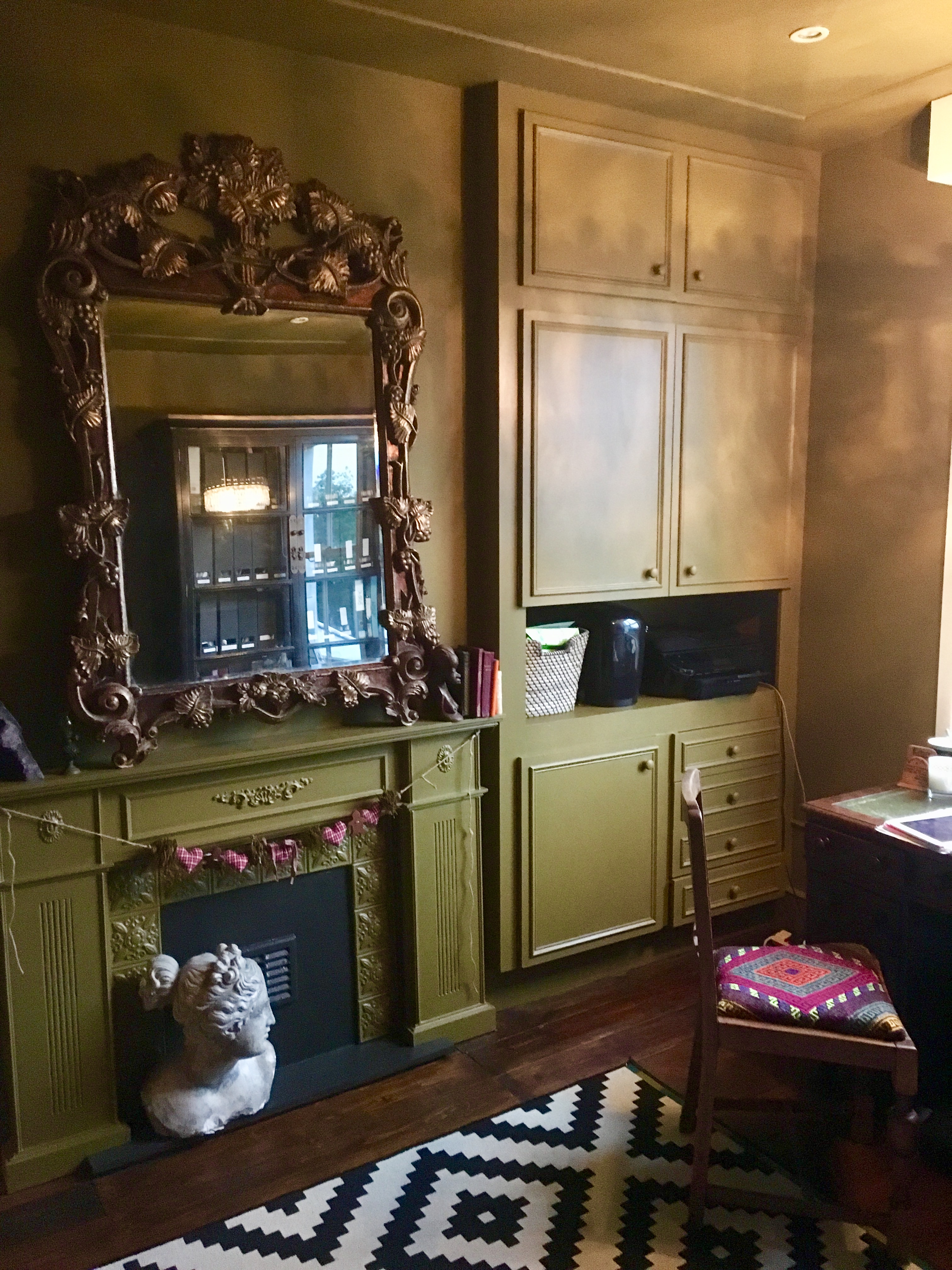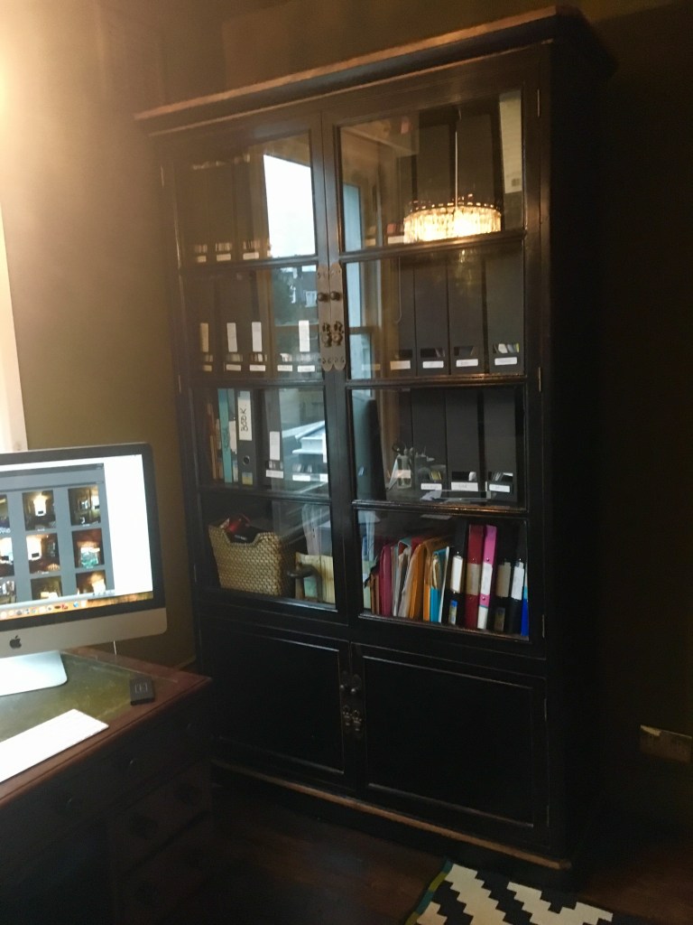 The mirror was our Christmas present, bought on Ebay for a bit of a bargain and I love it. The handles on the cupboards are just cheapy wooden ones painted to match. Now I can sit in my chair and imagine I’m silk merchant from the eighteenth century. The printer now sits happily and the storage in the cupboard works.