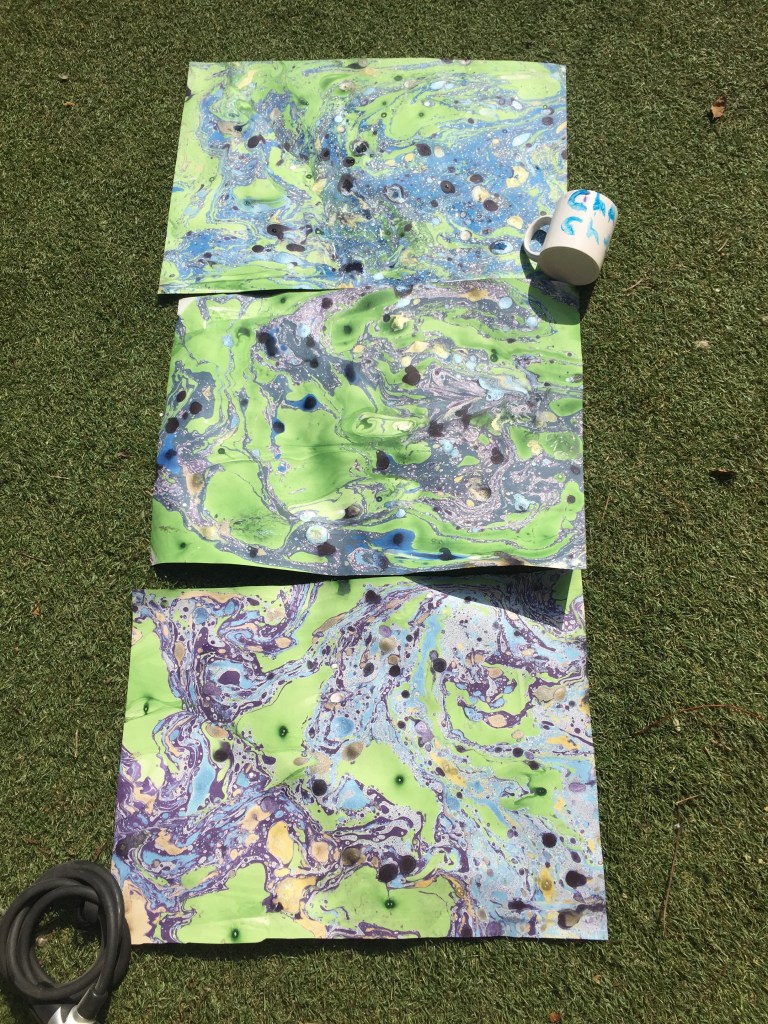 The marbling was part of the experimenting plan for diy wallpaper for the toilet..except the problem was we could only make it in small sizes which gave a patchwork effect. With printing we can make the runs as long as we need. Brucie bonus to control within the chaos.
